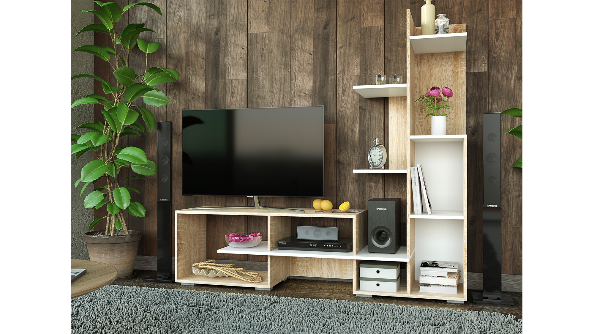 Элегантная тумба под телевизор, сочетающая в себе современный дизайн и практичность. Модель выполнена в стильном дуэте благородного дуба сонома и белоснежного покрытия, что создает изысканный контраст натуральных древесных оттенков и чистого белого цвета.