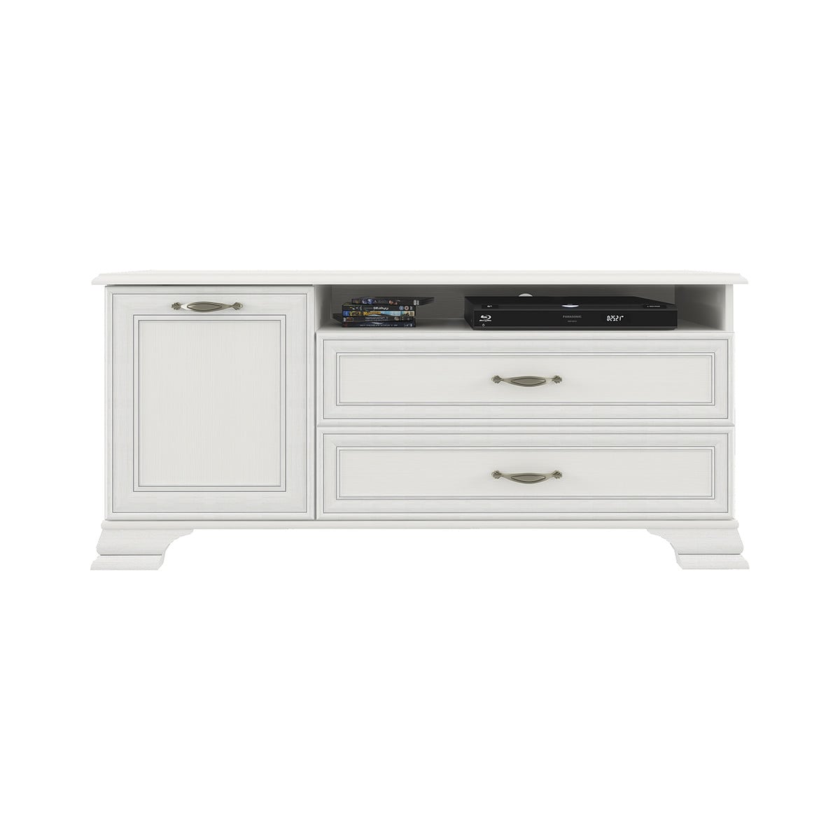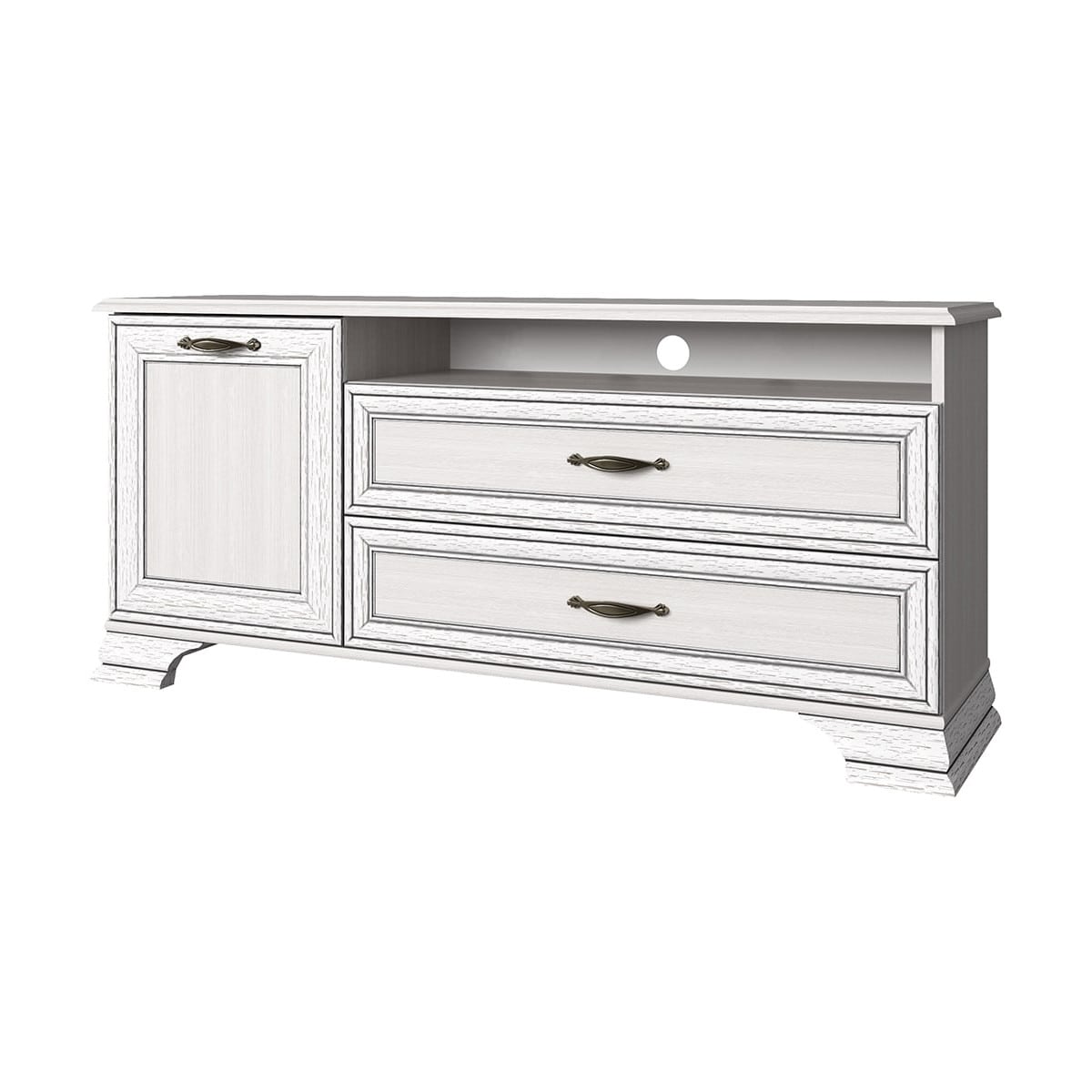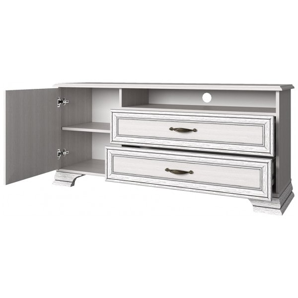 Тумба RTV 1D2SN Тиффани даёт возможность разместить технику выше, чем на тумбе RTV 2S2N. Тумба RTV 1D2SN – прямая. Имеет под верхним щитом открытую нишу (N) для расположения других видов техники небольших размеров, два выдвижных ящика (2S) для хранения мелких предметов (пульты, провода, батарейки, а также газеты, журналы, фотоальбомы и другие вещи), за глухой дверью – отделение с полкой (1D). Дверь распашная, крепится на петлях к боковине.