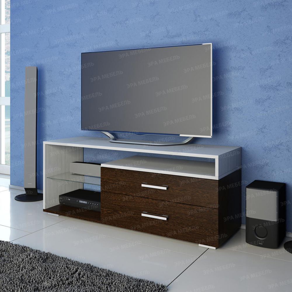 Тумба TV 2 имеет два выдвижных ящика, нишу для аппаратуры, стеклянную полку. Ее современный стиль и контрастное сочетание цветов помогут создать неповторимый стиль в гостиной.