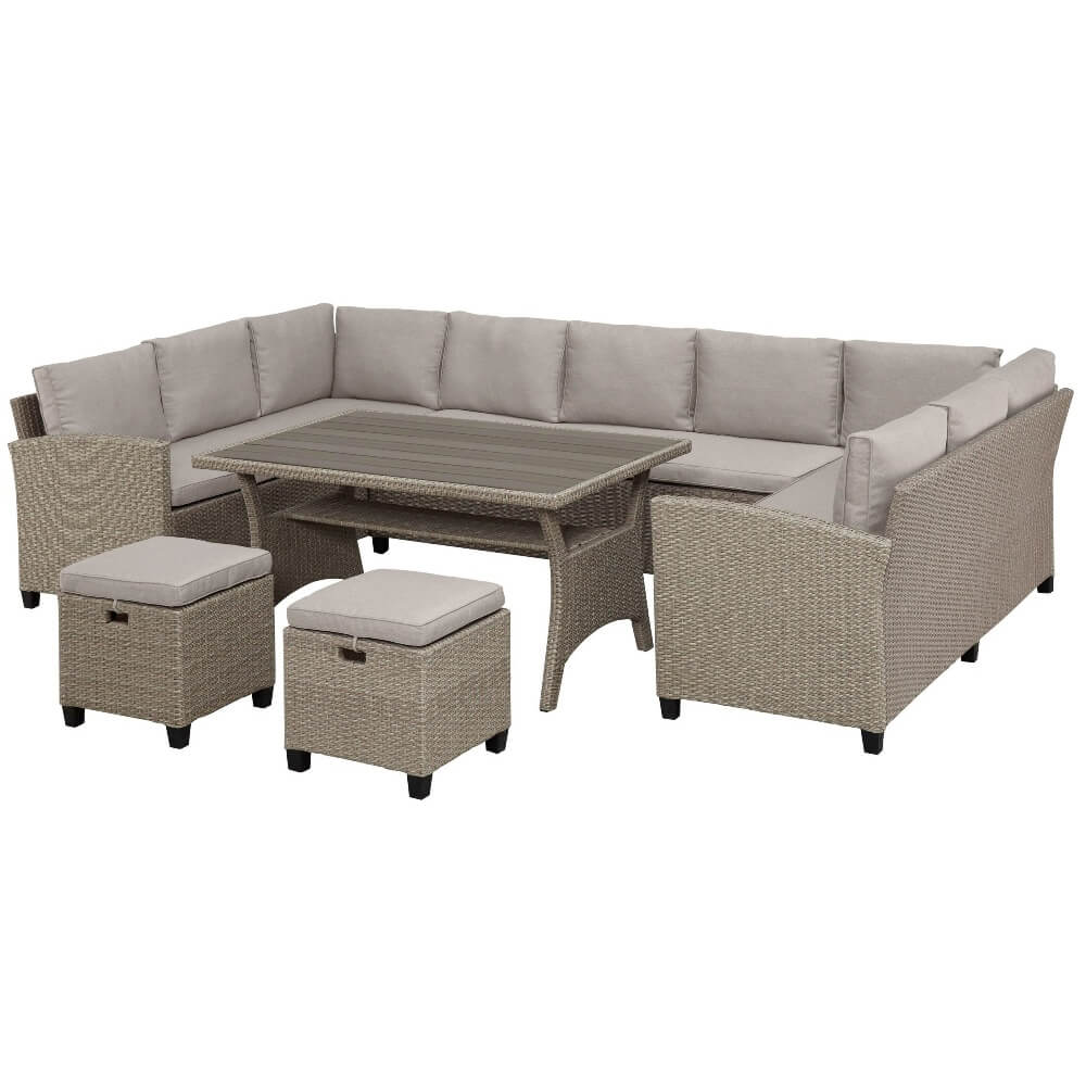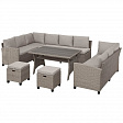 В составе комплекта: 3 дивана, стол и 2 пуфа. Высококачественная лоза из полиротанга бежевого цвета стойкая к любым атмосферным явлениям. Крепкий стальной каркас с полимерным антивандальным покрытием и отличным качеством сварки. Изделие сплетено вручную мастерами под жестким контролем качества на каждом этапе производства. Лоза максимально приближена по рельефу и текстуре к естественному материалу. Идеально подходит для использования на улице и внутри помещения в любую погоду. Не боится воды, солнца и минусовой температуры. Диваны можно скрепить между собой скобами или раздвинуть друг от друга.
