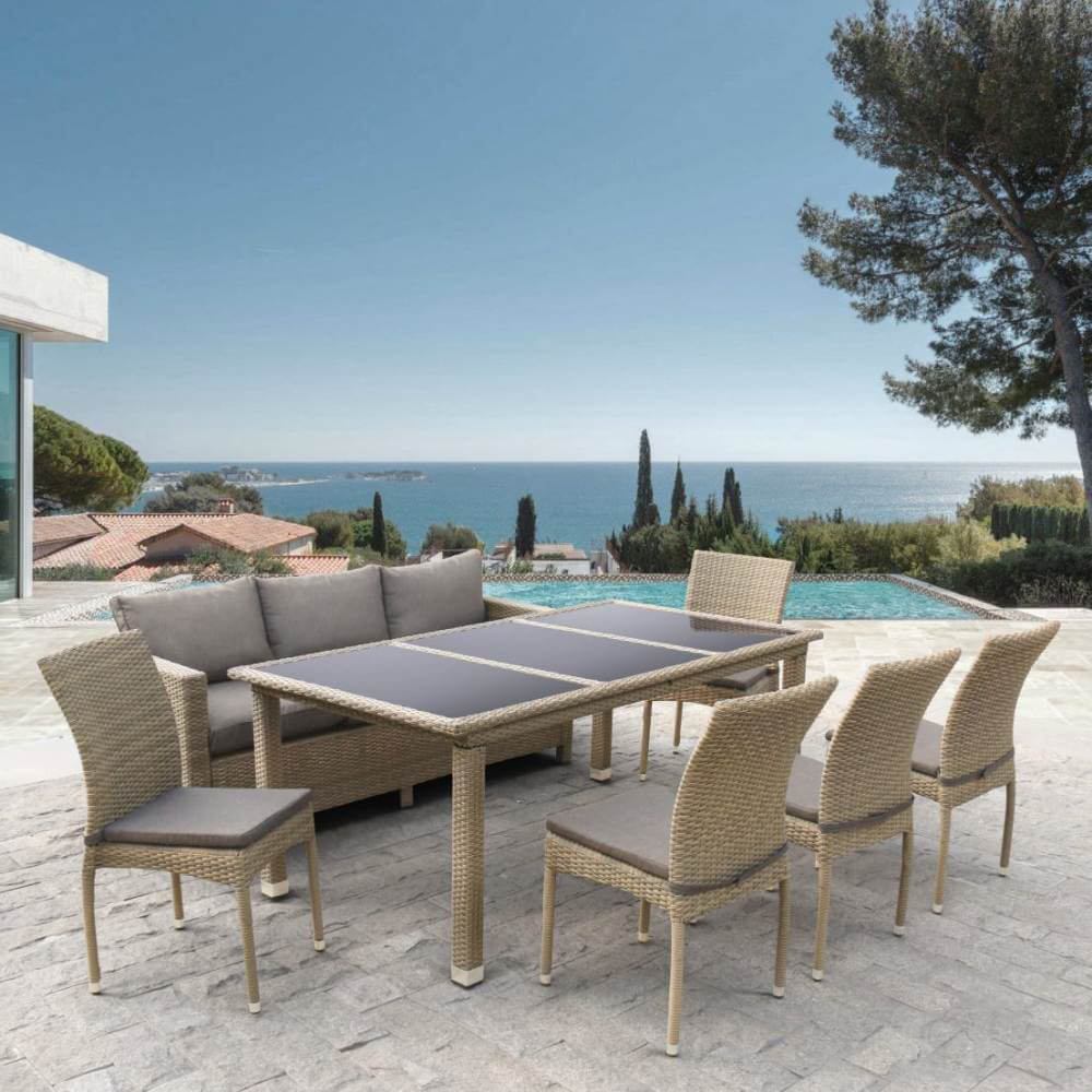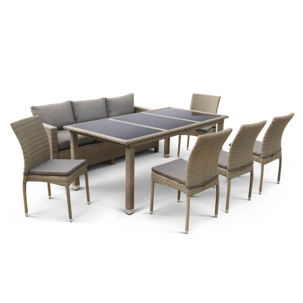 В составе комплекта: стол, трех местный диван и 5 стульев. Высококачественная лоза из двойного полукруглого полиротанга светло-коричневого цвета стойкая к любым атмосферным явлениям. Крепкий стальной каркас с полимерным антивандальным покрытием и отличным качеством сварки. Изделие сплетено вручную мастерами под жестким контролем качества на каждом этапе производства. Лоза максимально приближена по рельефу и текстуре к естественному материалу. Идеально подходит для использования на улице и внутри помещения в любую погоду. Не боится воды, солнца и минусовой температуры. Подушки входят в коплект на диван и стулья.