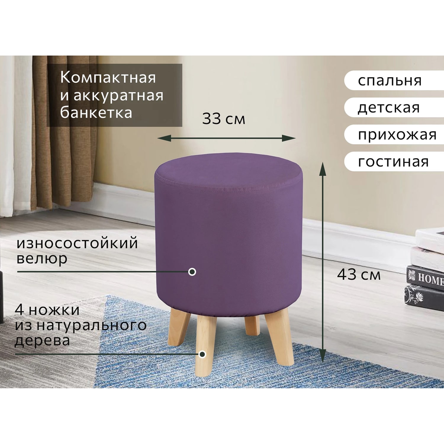 Круглая банкетка на ножках - это удобный и стильный предмет мебели, который может быть использован как место для сидения или как прикроватный пуфик. Она выполнена из ткани, что позволяет ей быть мягкой и удобной для сидения.