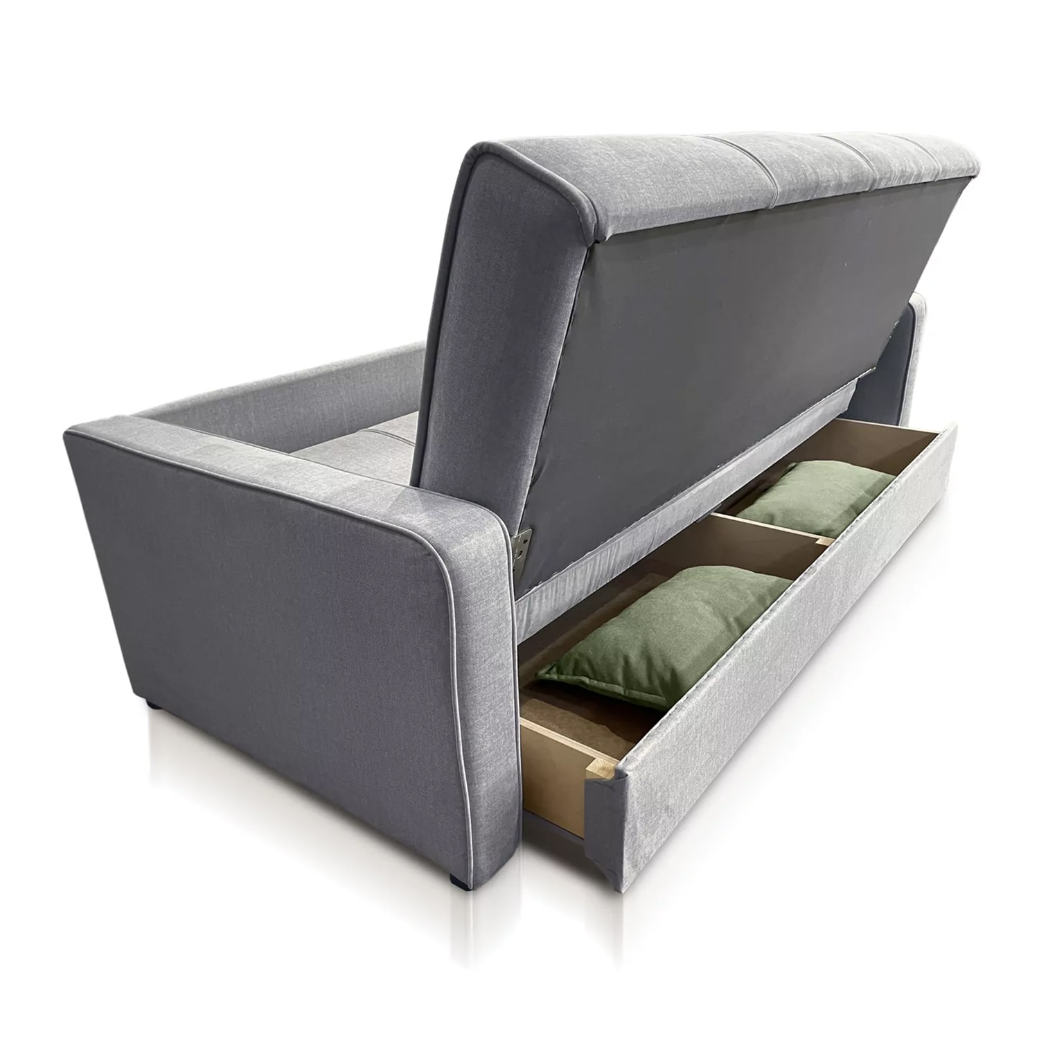 Под всей шириной сиденья установлен вместительный ящик для постельных принадлежностей из eco-березовой фанеры 15 мм.
