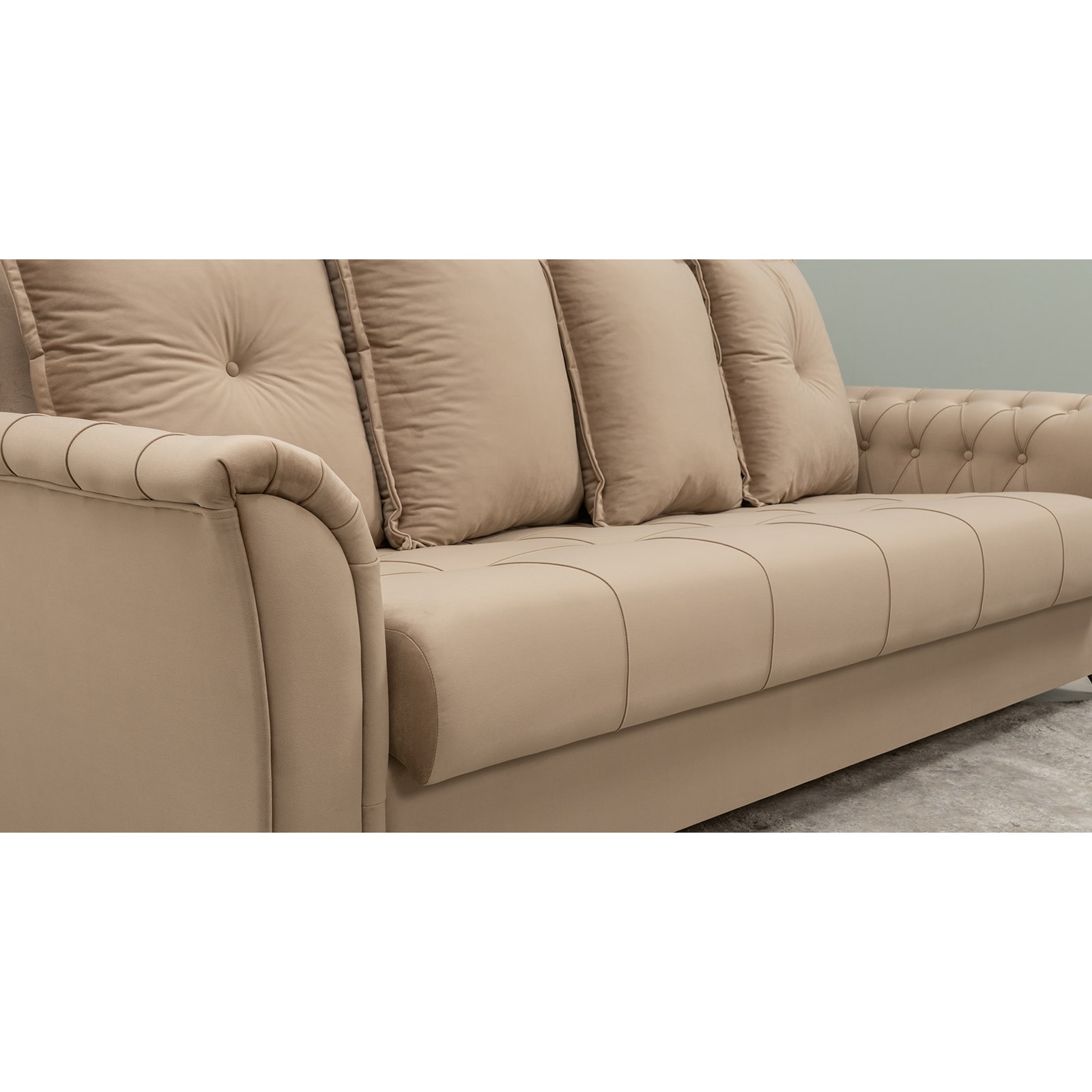 Декор: декоративная отстрочка, защипы и утяжка на сиденье, защипы и утяжка с пуговицами на подлокотниках. Утяжка с пуговицами на приспинных подушках.