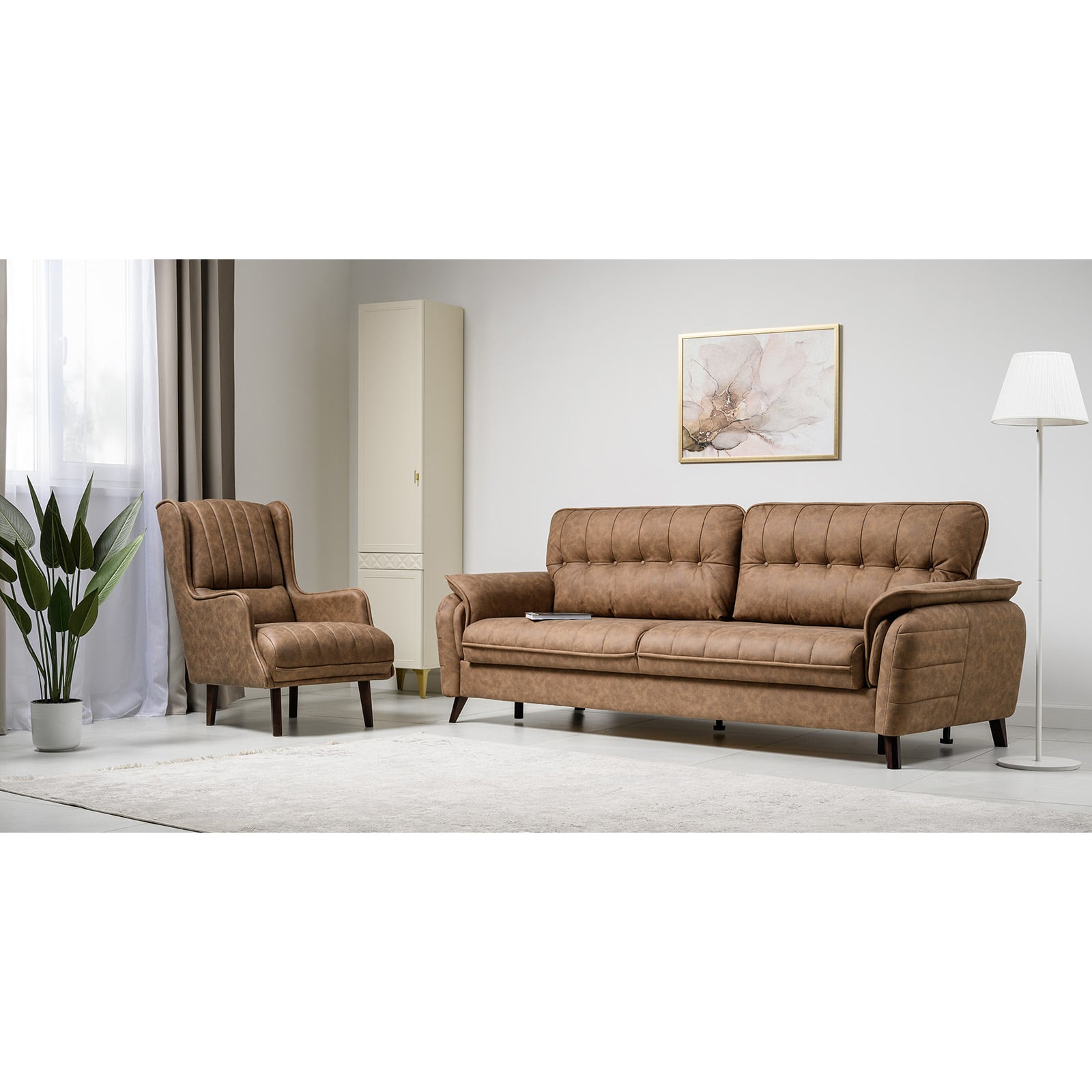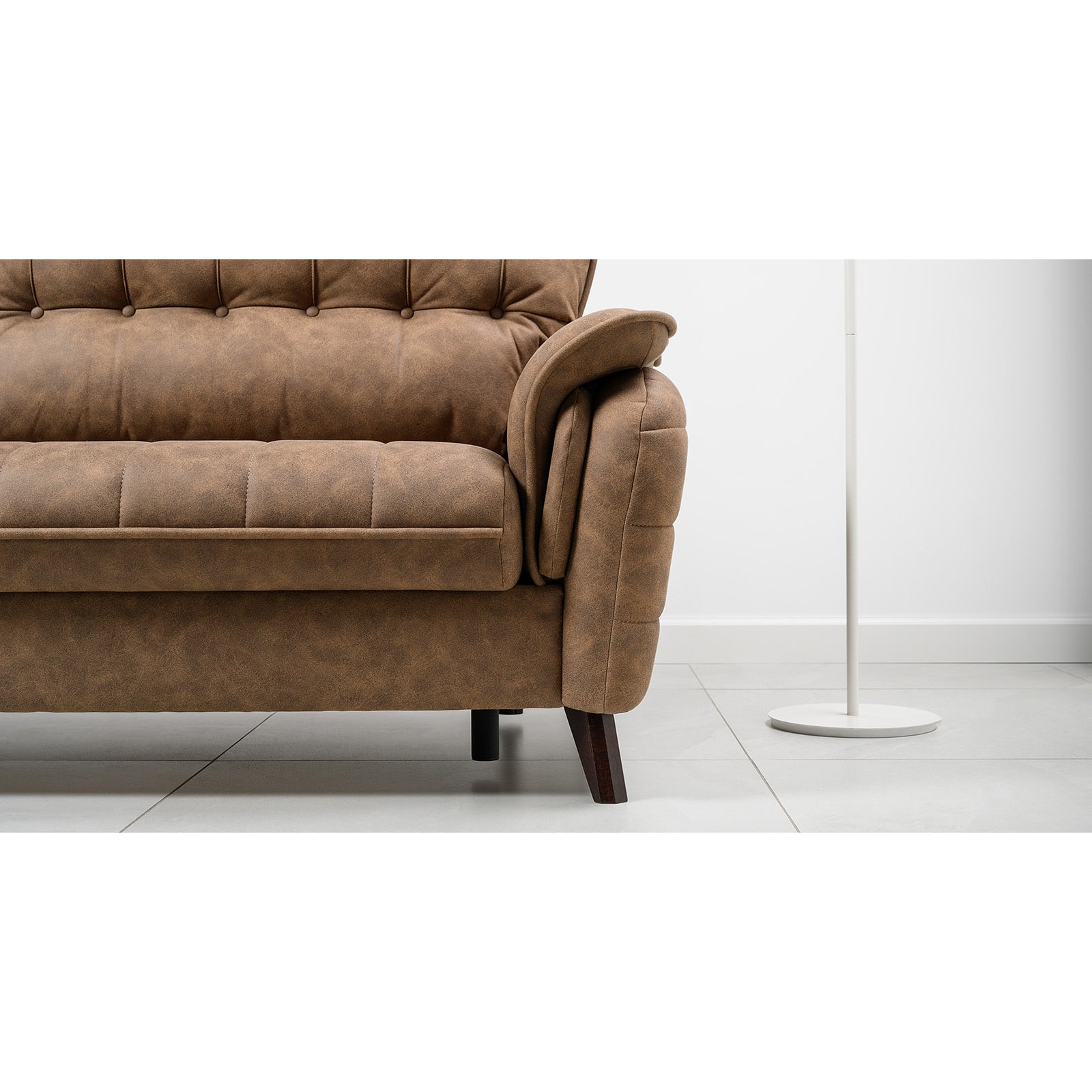 Декоративные канты на подушках дивана, подлокотниках и сиденье. Стежка на передней части сиденья и внешней части подлокотника. Защипы на верхней части подушки. Втяжки с пуговицами на приспинных подушках.
