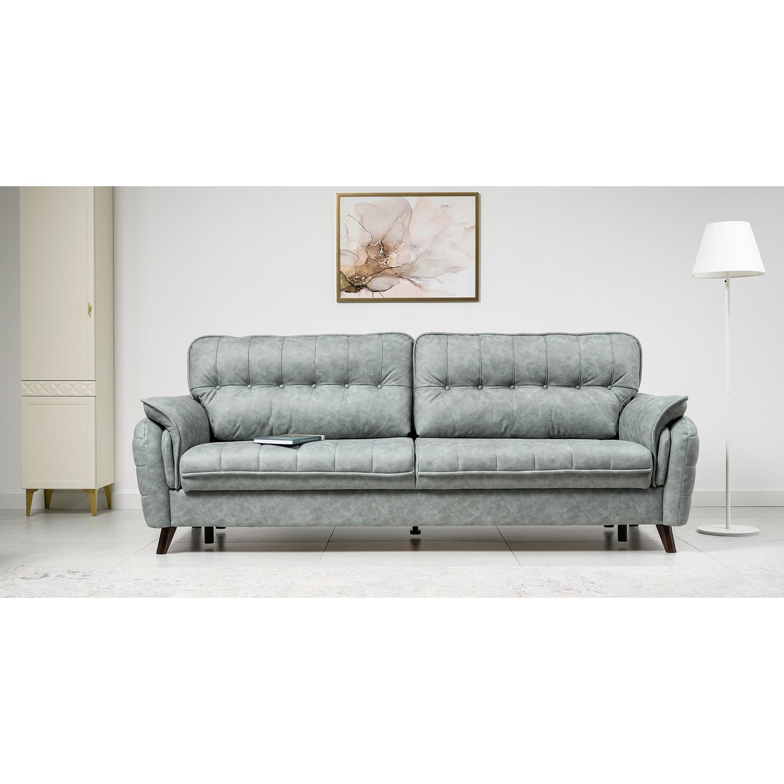 Обновленный дизайн дивана Дорис привлекает внимание роскошной фактурой искусственной замши с изысканным тиснением. Деревянные опоры подчёркивают восточный колорит, добавляя изделию изящности.
