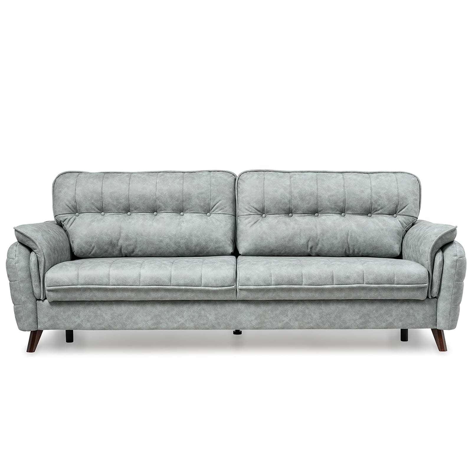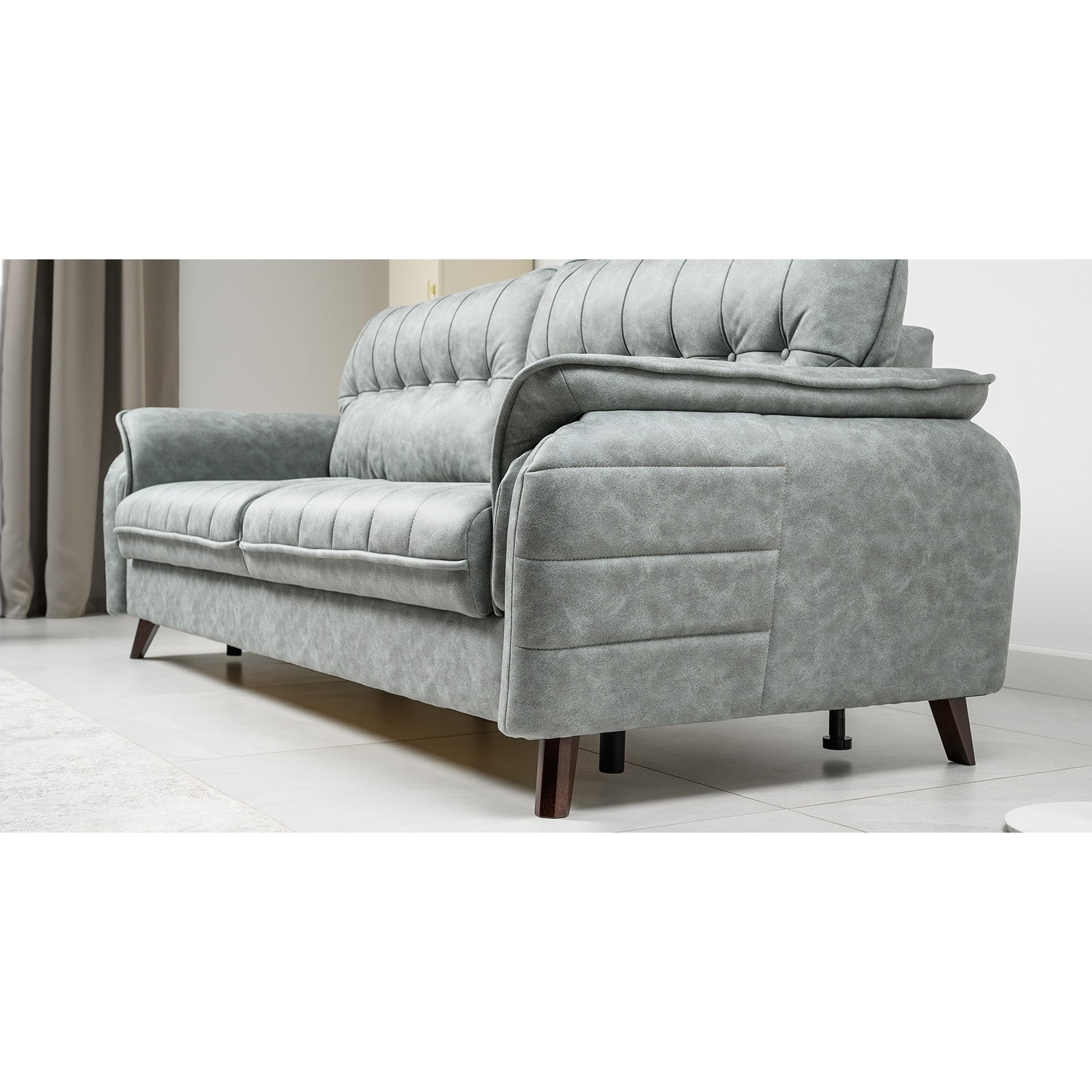 Декоративные канты на подушках дивана, подлокотниках и сиденье. Стежка на передней части сиденья и внешней части подлокотника. Защипы на верхней части подушки. Втяжки с пуговицами на приспинных подушках.