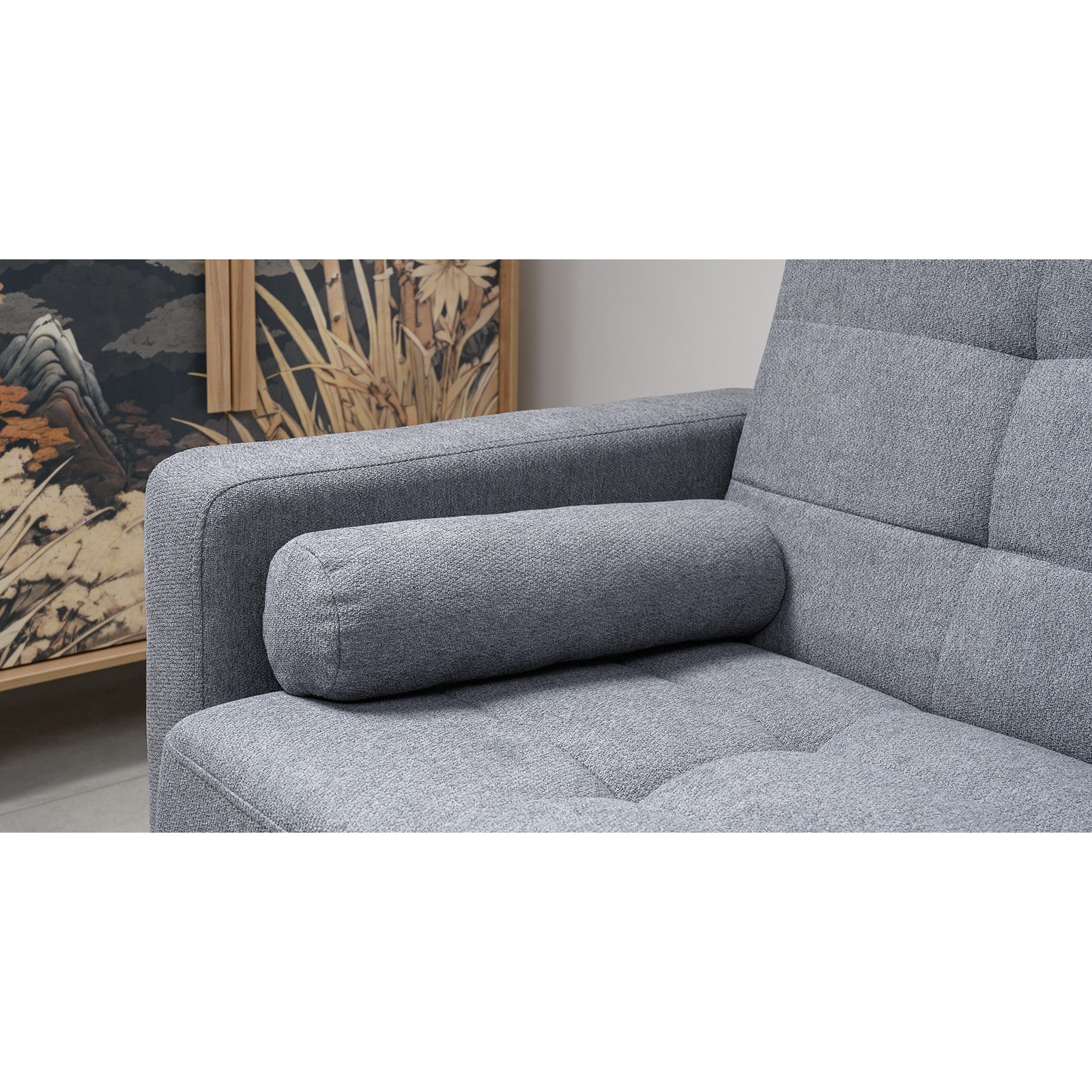 Декор: прямоугольная стежка по спинке, посадочному месту и подлокотниках, круглые подушки-валики.