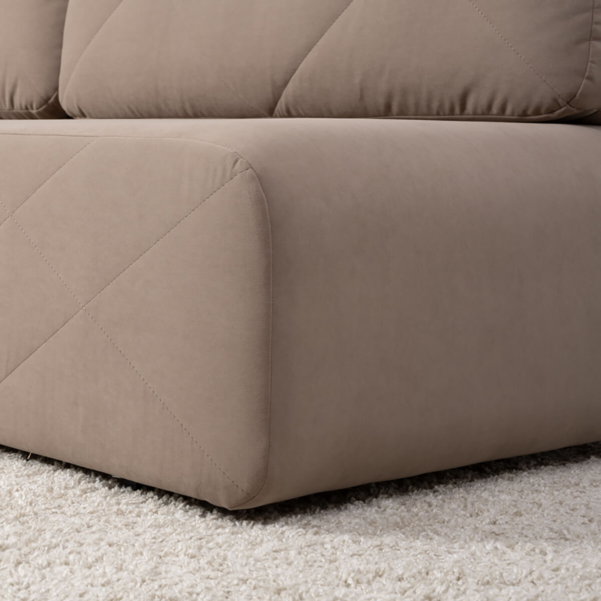 Декор: По передней части приспинных подушек и по передней части дивана проходит оригинальная стежка из диагональных строчек. Закругленные углы корпуса подчеркивают мягкие линии изделия, создают ощущение уюта и безопасности, а также отлично сочетаются с общей концепцией лаконичного дизайна.