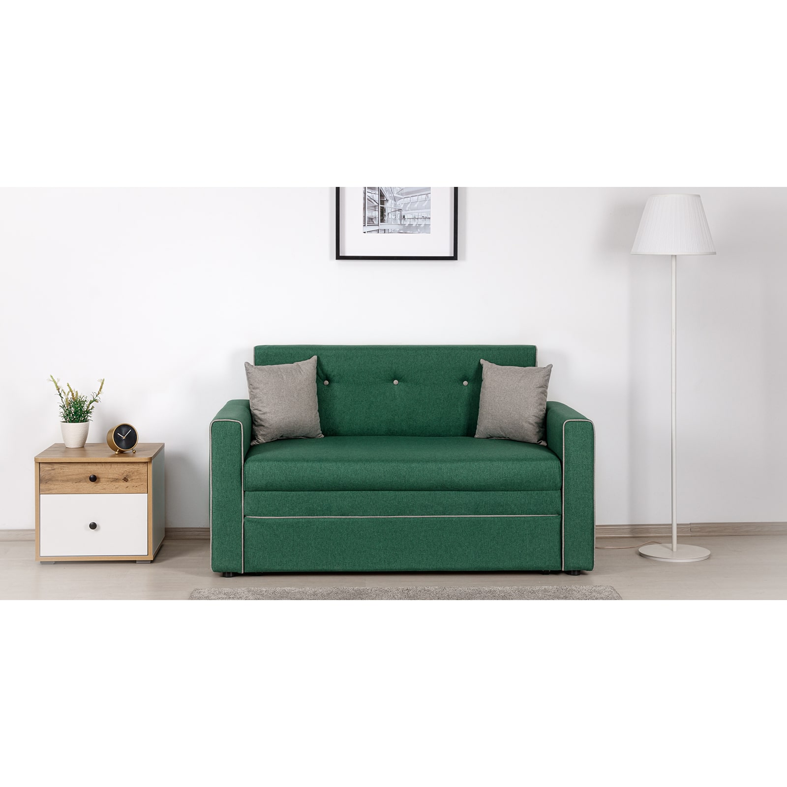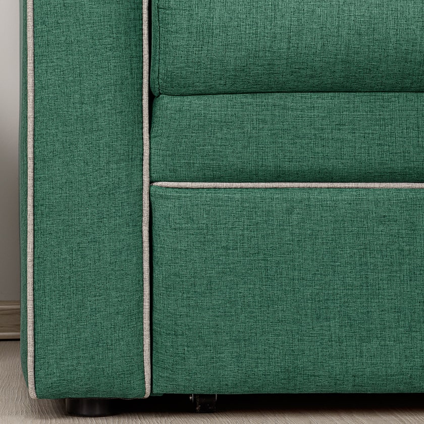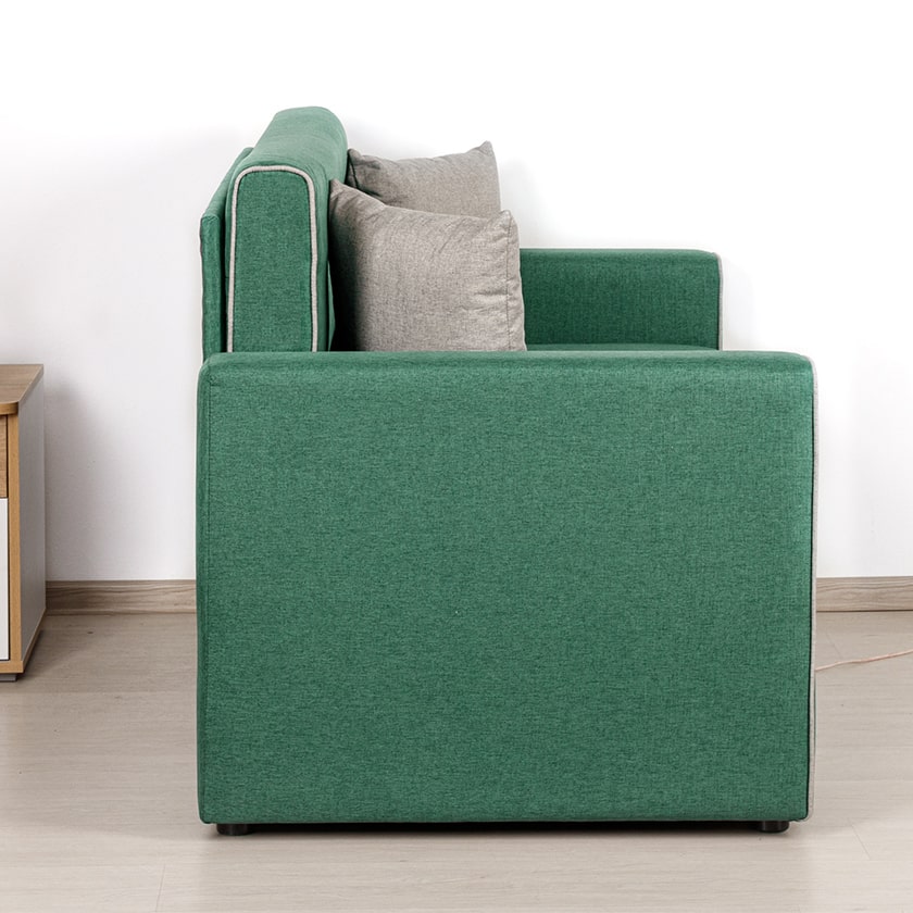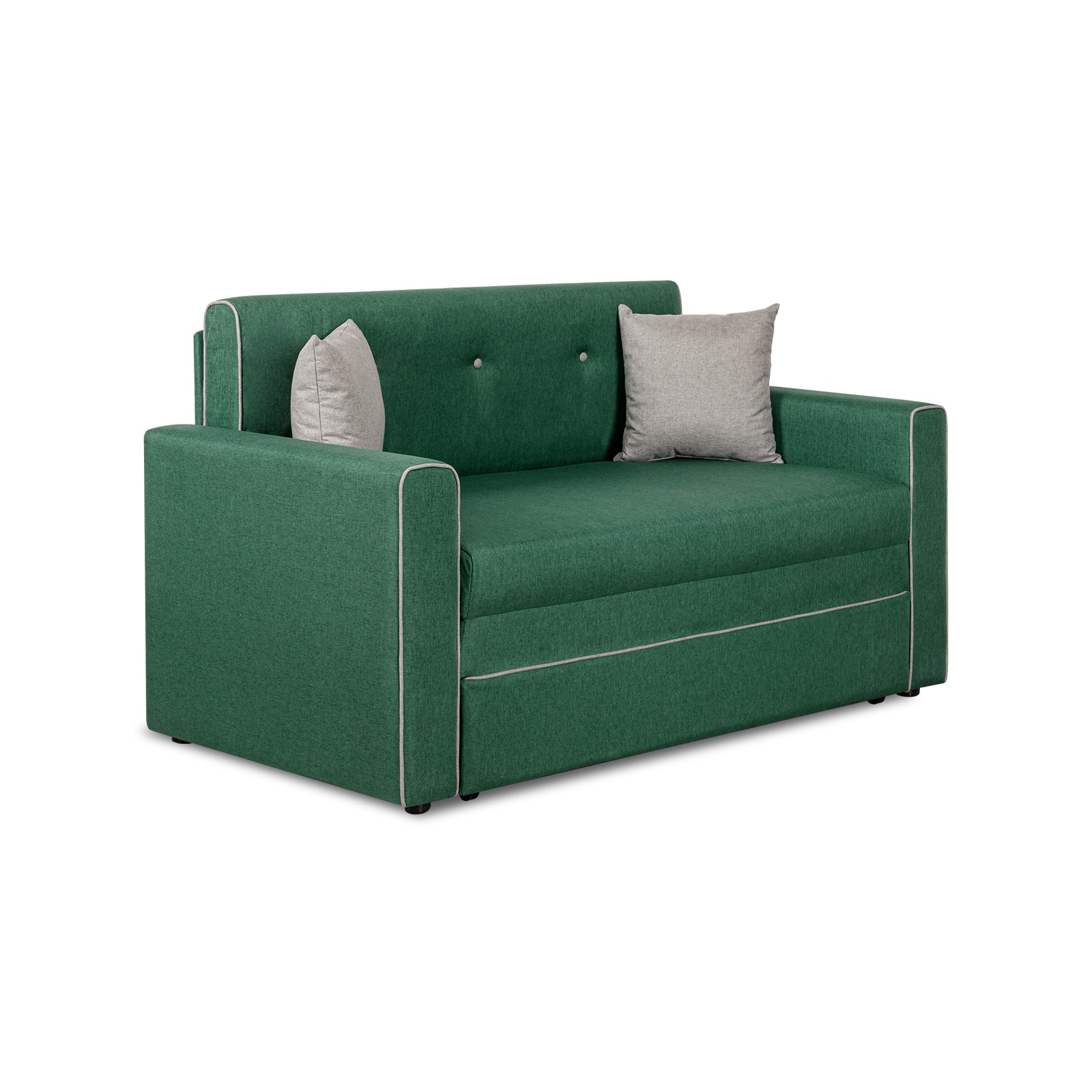 Декоративный контрастный кант по торцу спинки, торцу подлокотника, по верхнему срезу царги. Утяжки с пуговицами на спинке дивана. Две декоративные подушки в контрастной ткани.