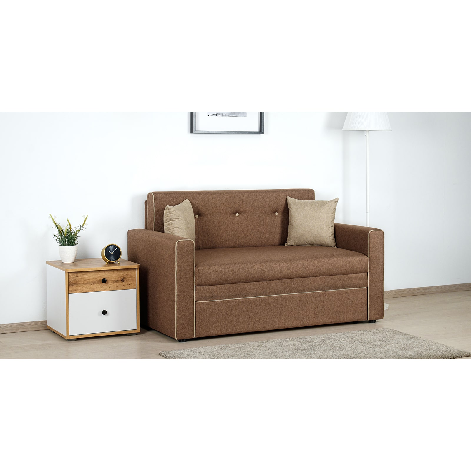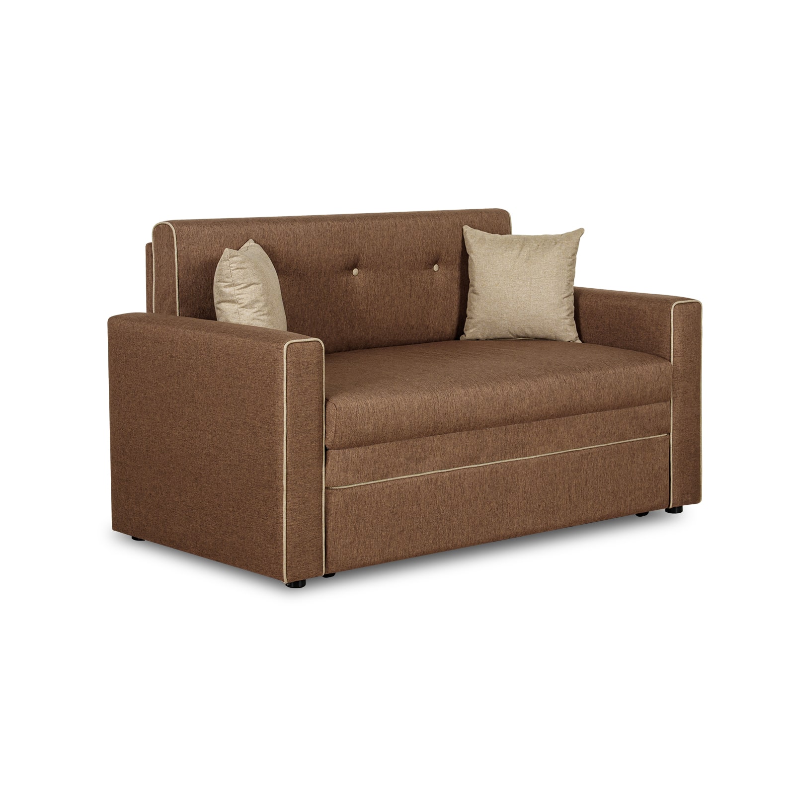 Декоративный контрастный кант по торцу спинки, торцу подлокотника, по верхнему срезу царги. Утяжки с пуговицами на спинке дивана. Две декоративные подушки в контрастной ткани.