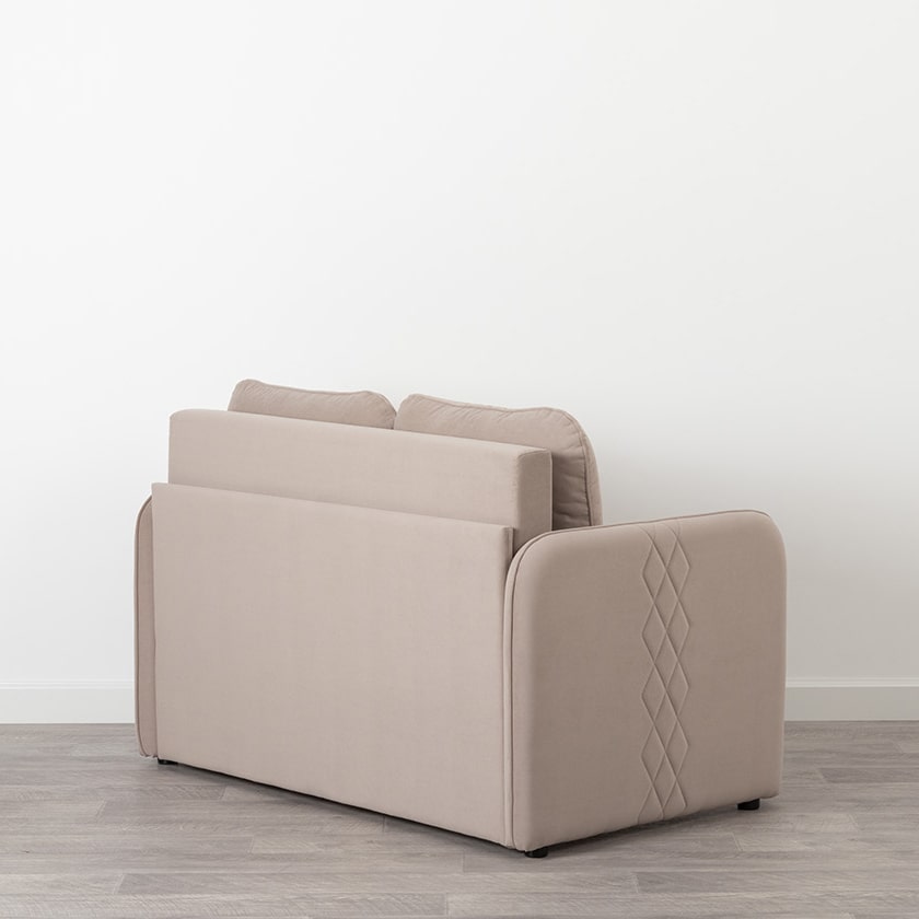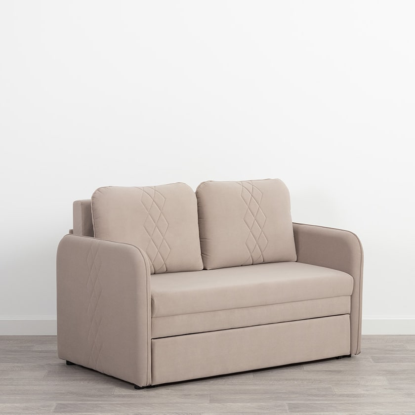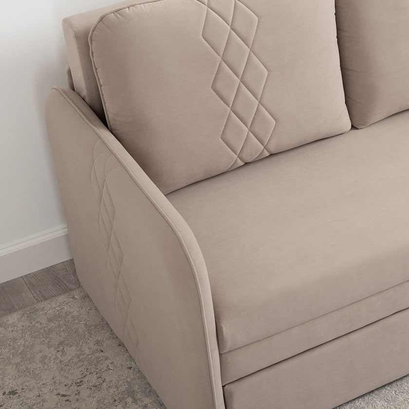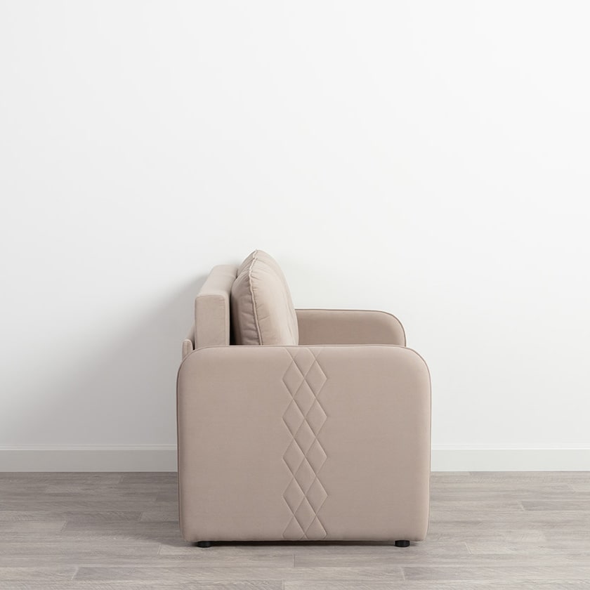 Стильный компактный диван для детской и гостиной. При своих скромных размерах он трансформируется в полноценное спальное место для детей и подростков. Лаконичный дизайн в виде декоративной отстрочки подчеркивает фактуру велюра, а небольшие размеры позволят разместить его в любом пространстве.