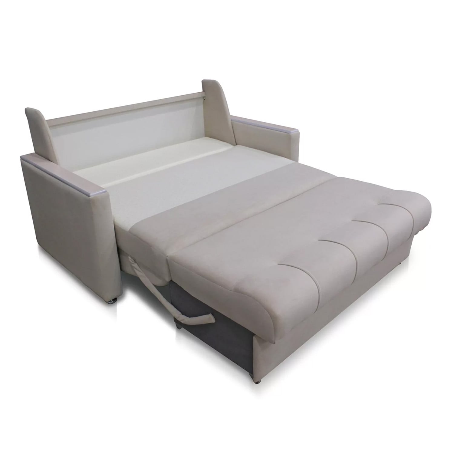 Простая и надежная система трансформации "Дуги-кронштейны" . Разложить диван очень просто. Для этого нужно спинку дивана потянуть вниз, сиденье на прорезиненных колесиках выкатится вперед. Затем опустить подголовник. Диван-кровать готов к использованию.