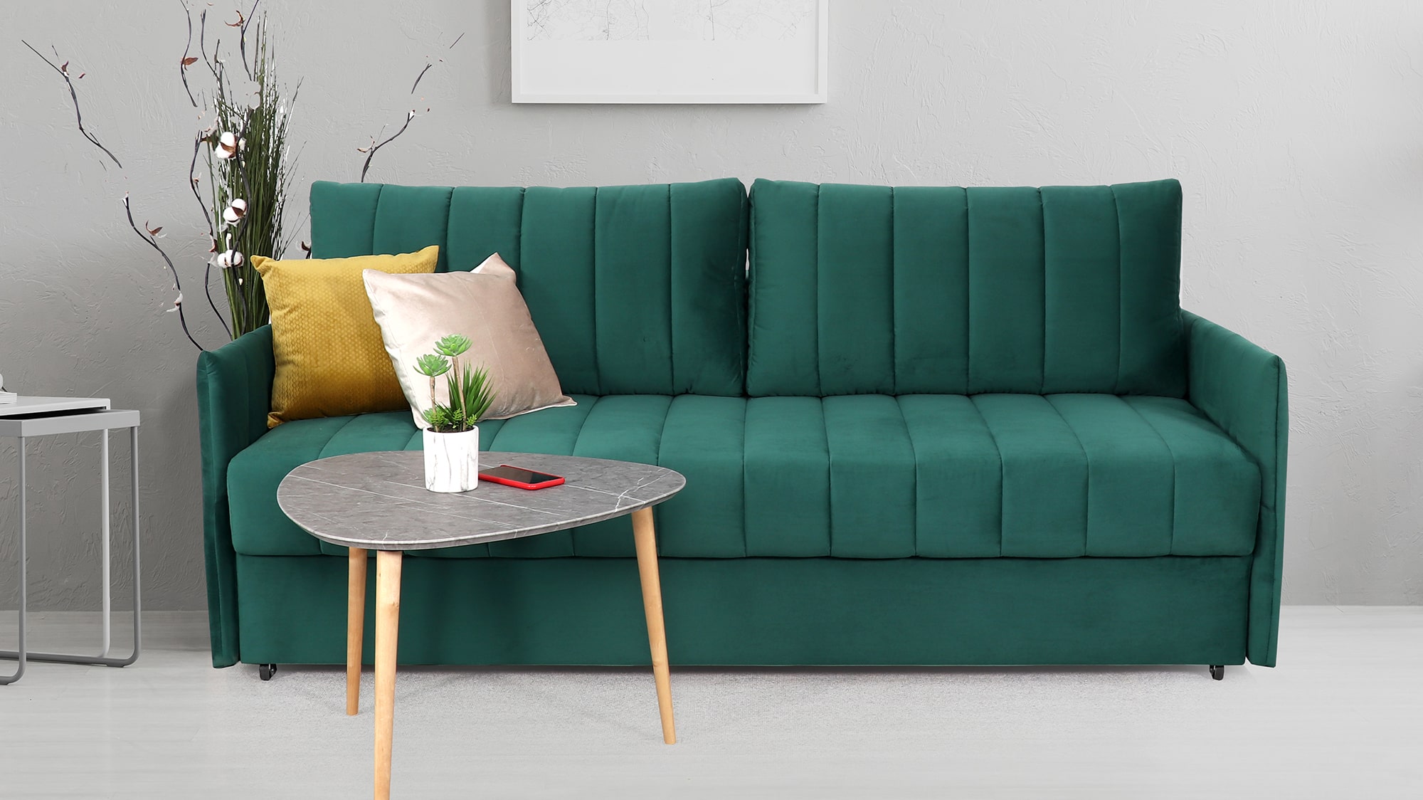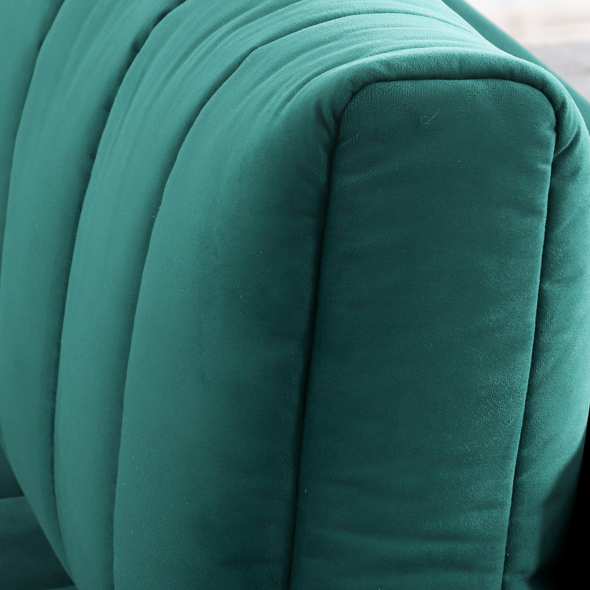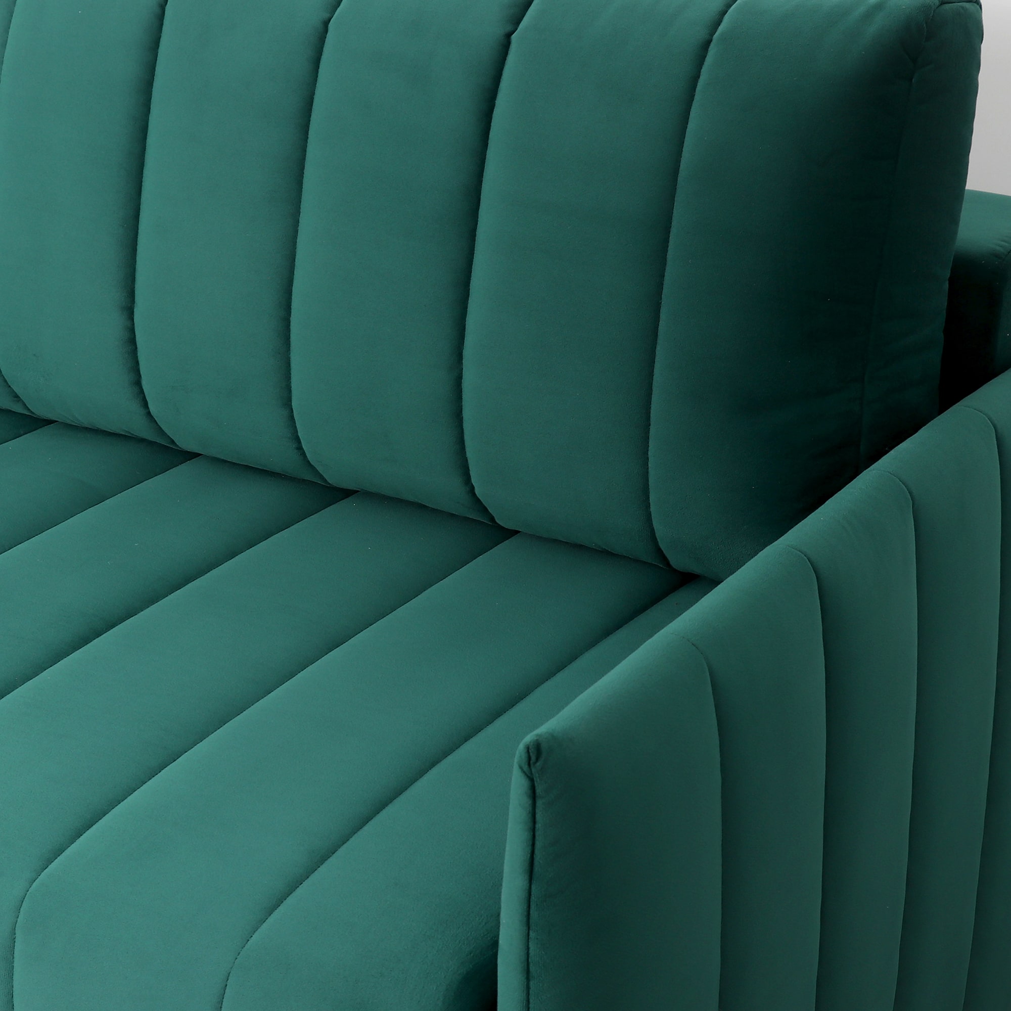 Подушки, сиденье и подлокотники дивана оформлены модной вертикальной стёжкой в современном стиле.