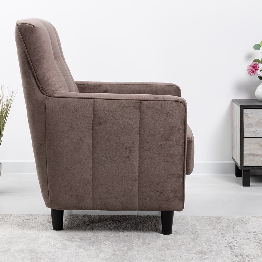 Лаконичное кресло АРНО с комфортной посадкой дополнит современный интерьер. Высокие ножки из массива делают кресло визуально лёгким и уместным в комнате любой площади, а задняя спинка в ткани основы позволит использовать его для зонирования пространства.