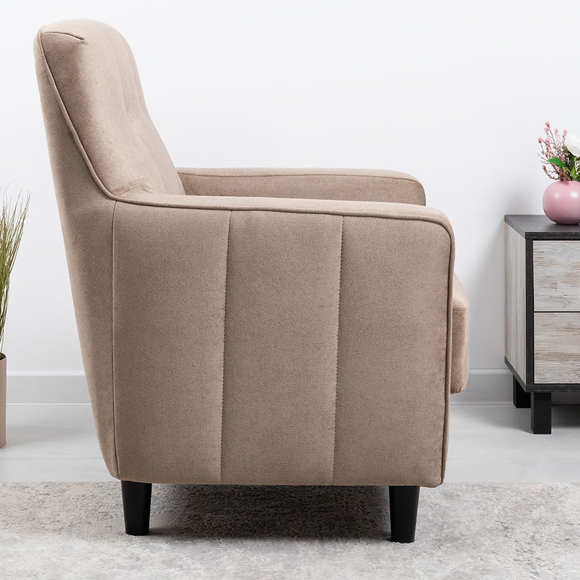 Лаконичное кресло АРНО с комфортной посадкой дополнит современный интерьер. Высокие ножки из массива делают кресло визуально лёгким и уместным в комнате любой площади, а задняя спинка в ткани основы позволит использовать его для зонирования пространства.