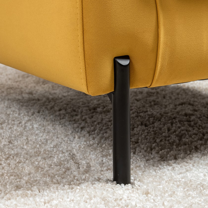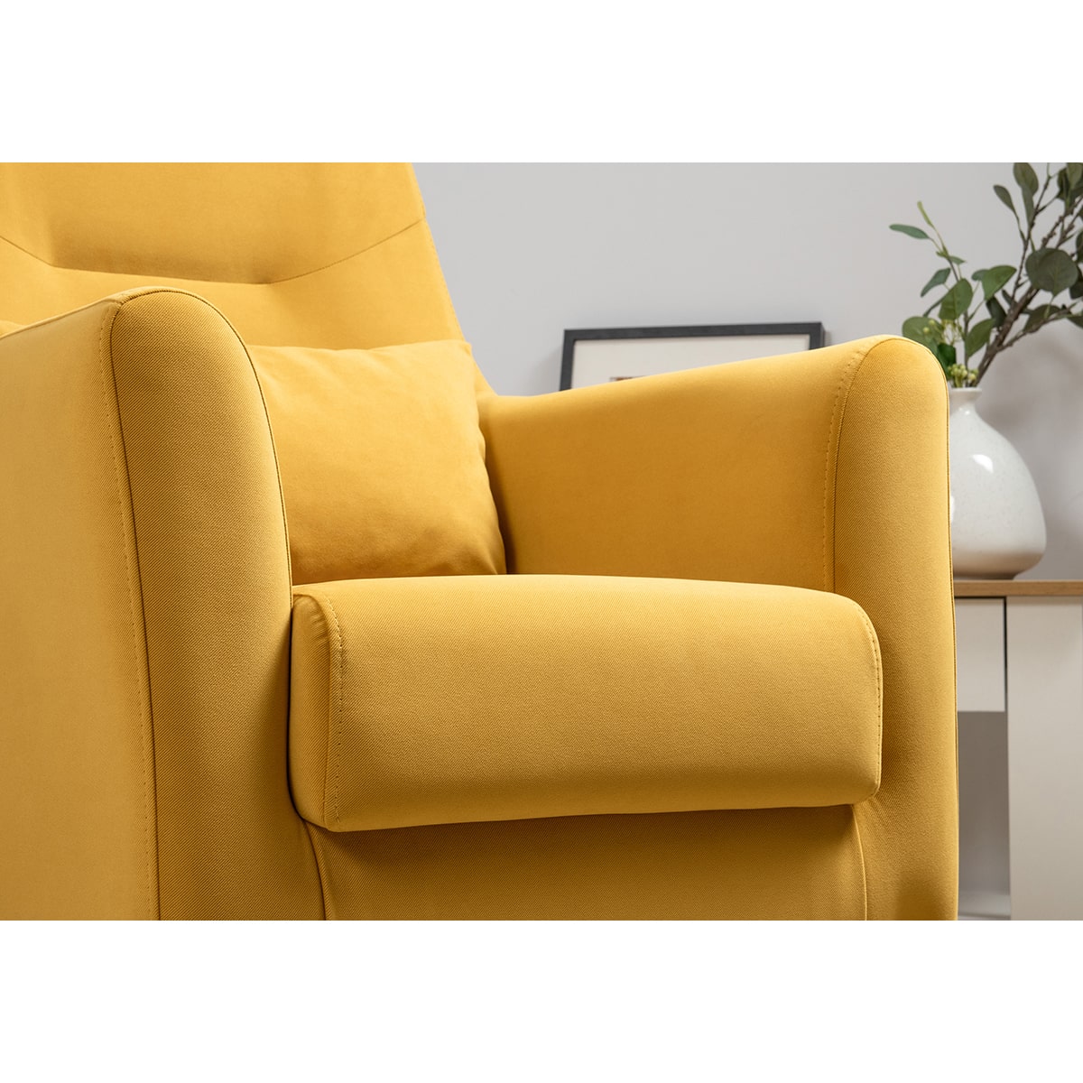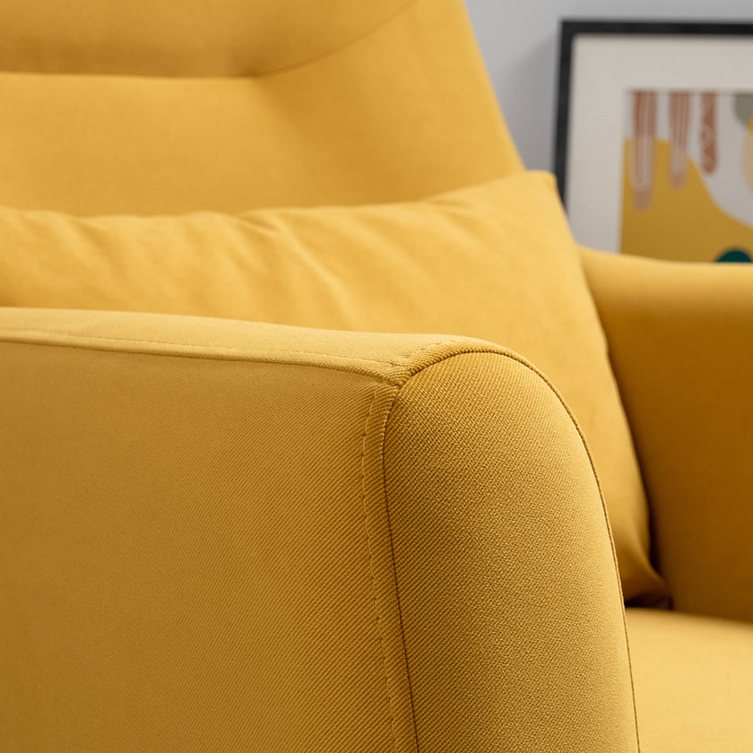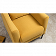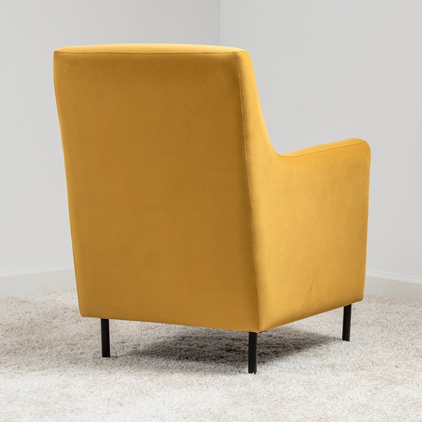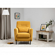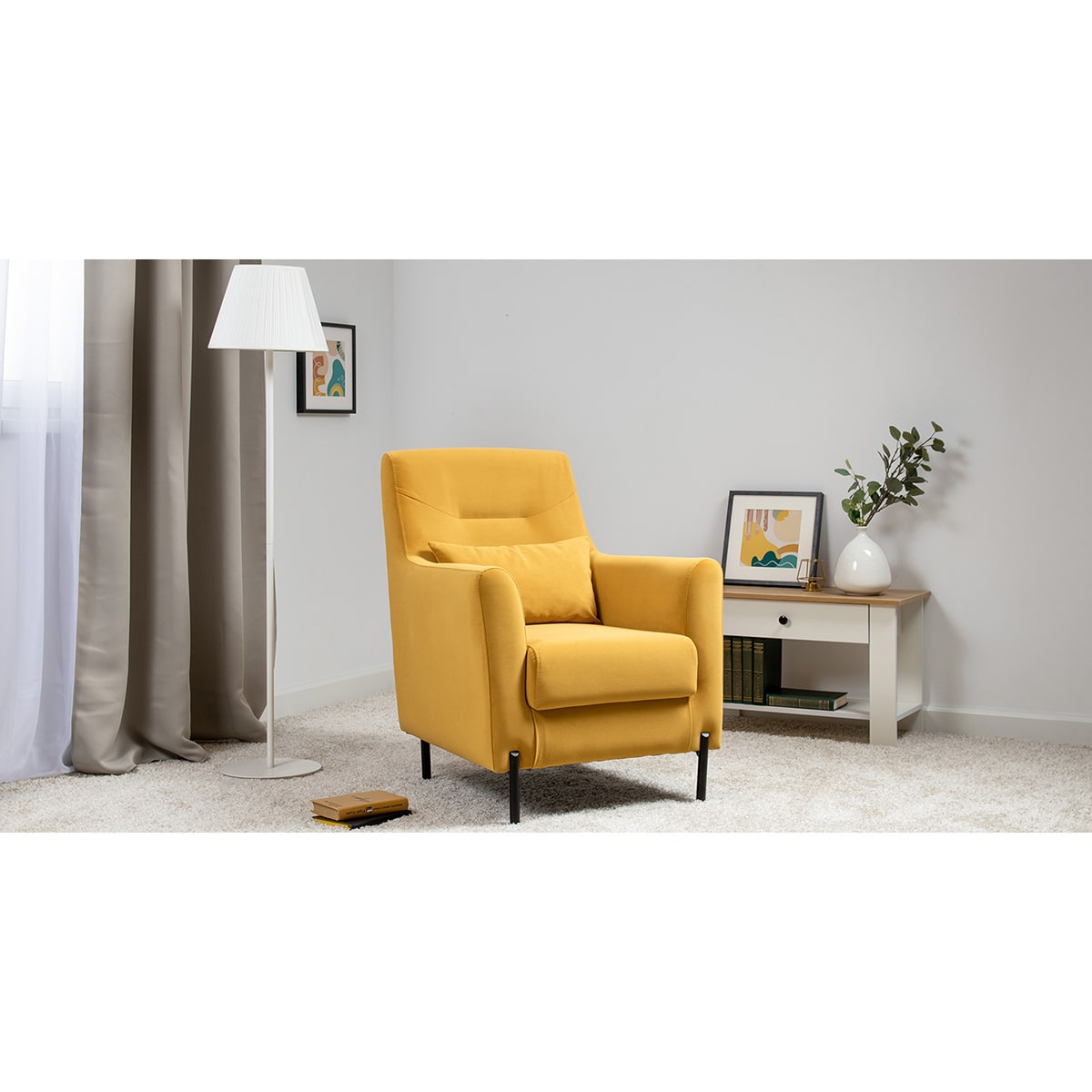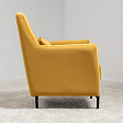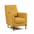 Декоративная утяжка на спинке кресла, декоративная подушка в цвете кресла, металлические опоры переходят в декоративный элемент подлокотника.