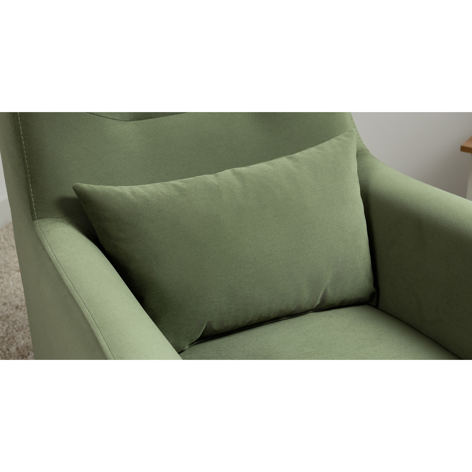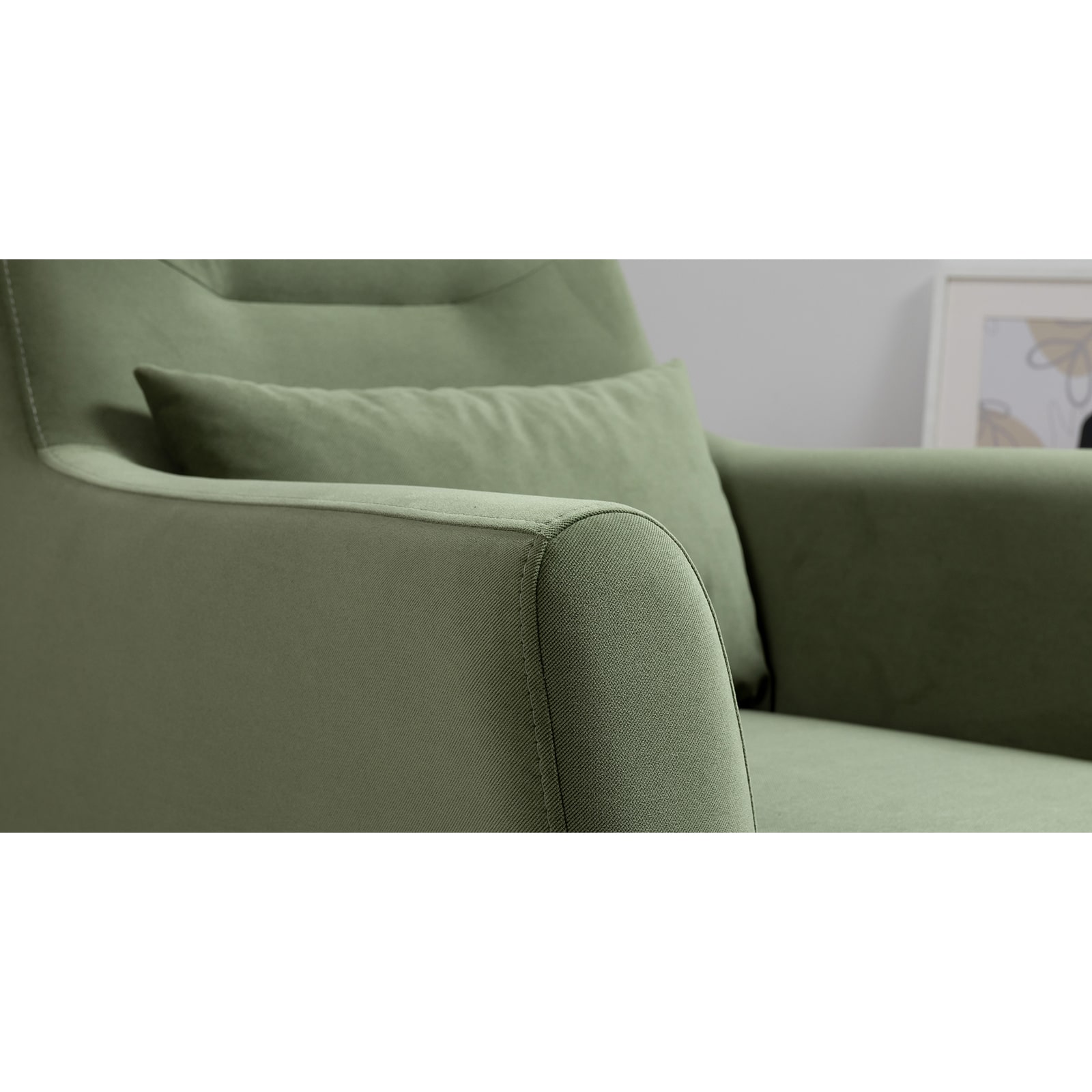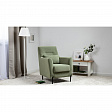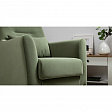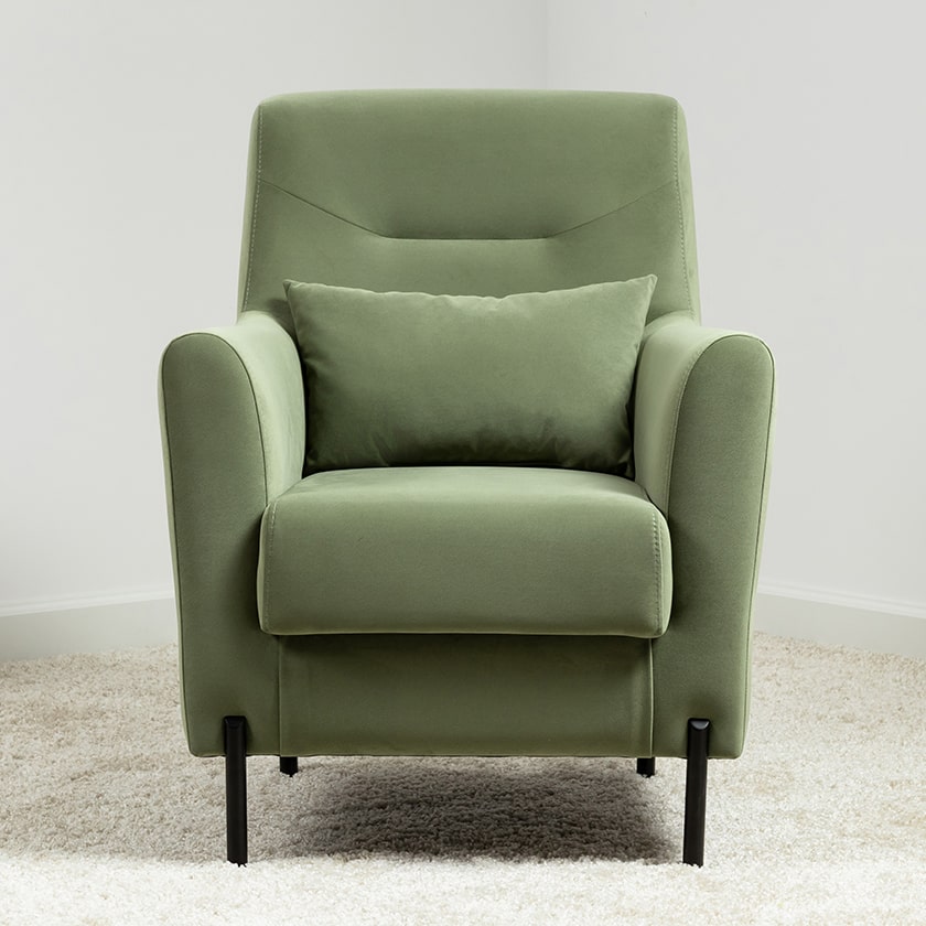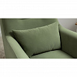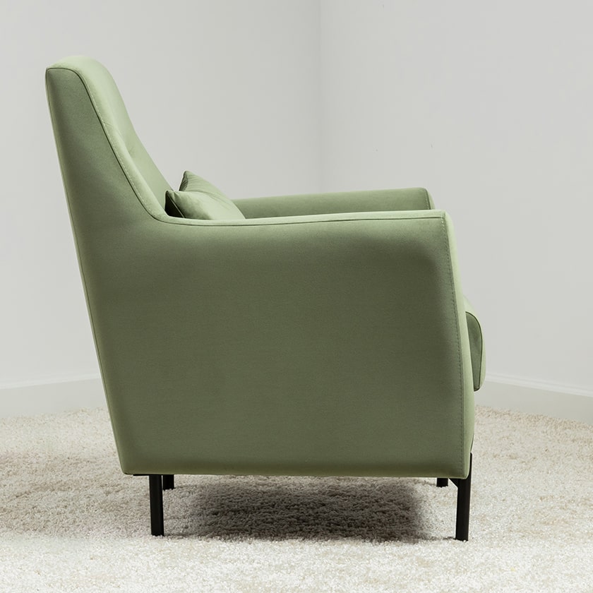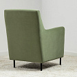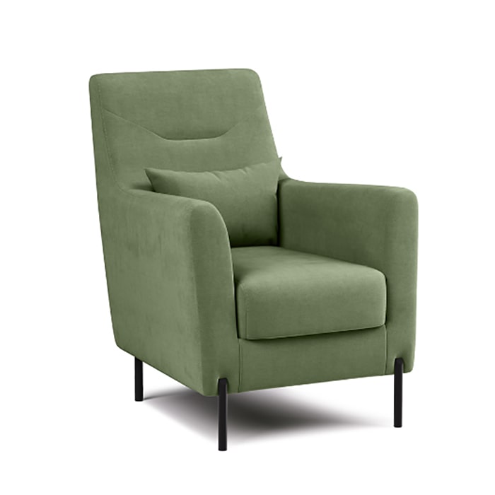 Декоративная утяжка на спинке кресла, декоративная подушка в цвете кресла, металлические опоры переходят в декоративный элемент подлокотника.