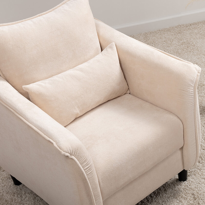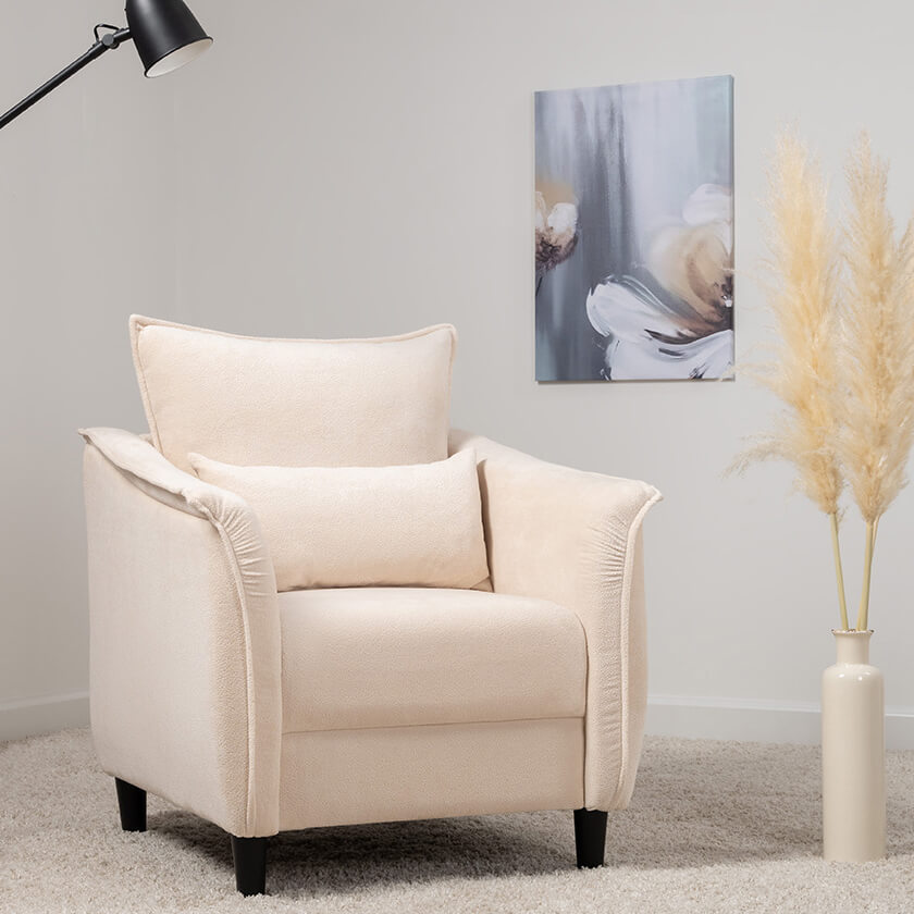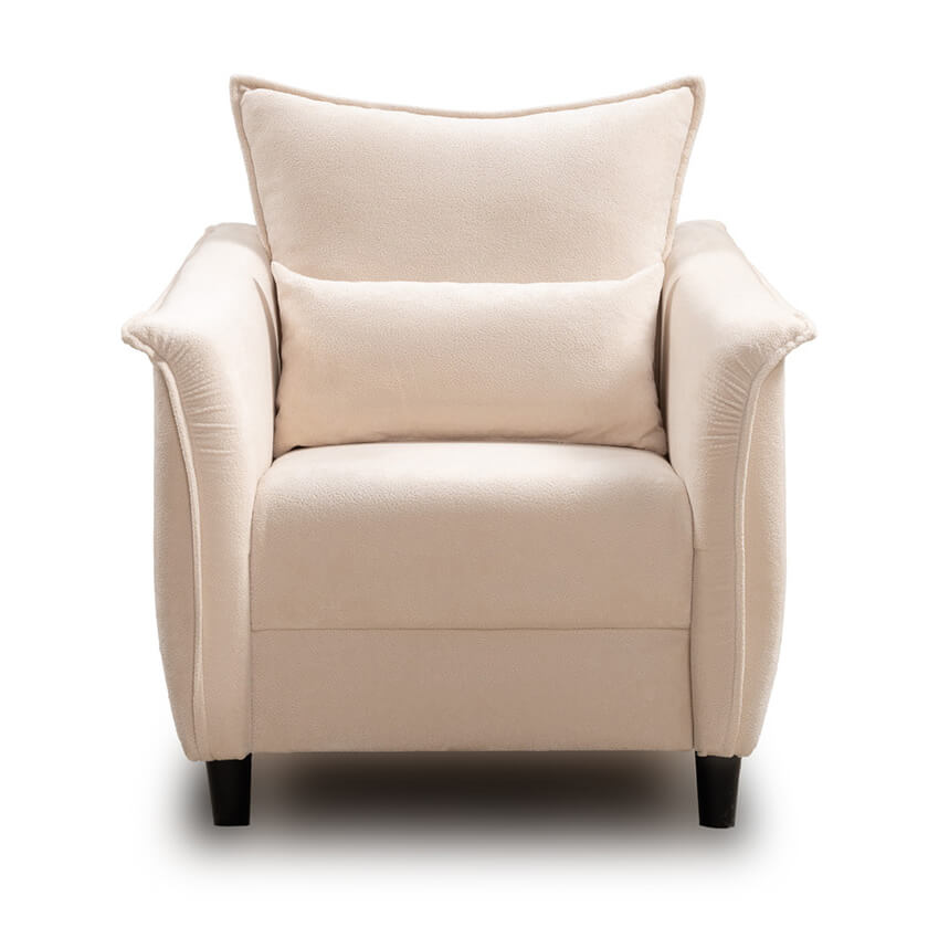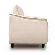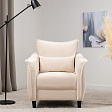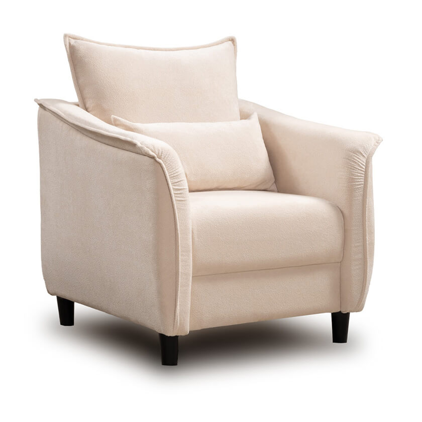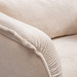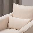 Кресло с приспинной подушкой трапецивидной формы на молнии, по трем сторонам которой проложена отделочная строчка на 1,2 см. По контуру боковин проложен декоративный кант на 1,2 см основной ткани. Кант проходит по центру передней части боковины, а по внутренней верхней части сборка.