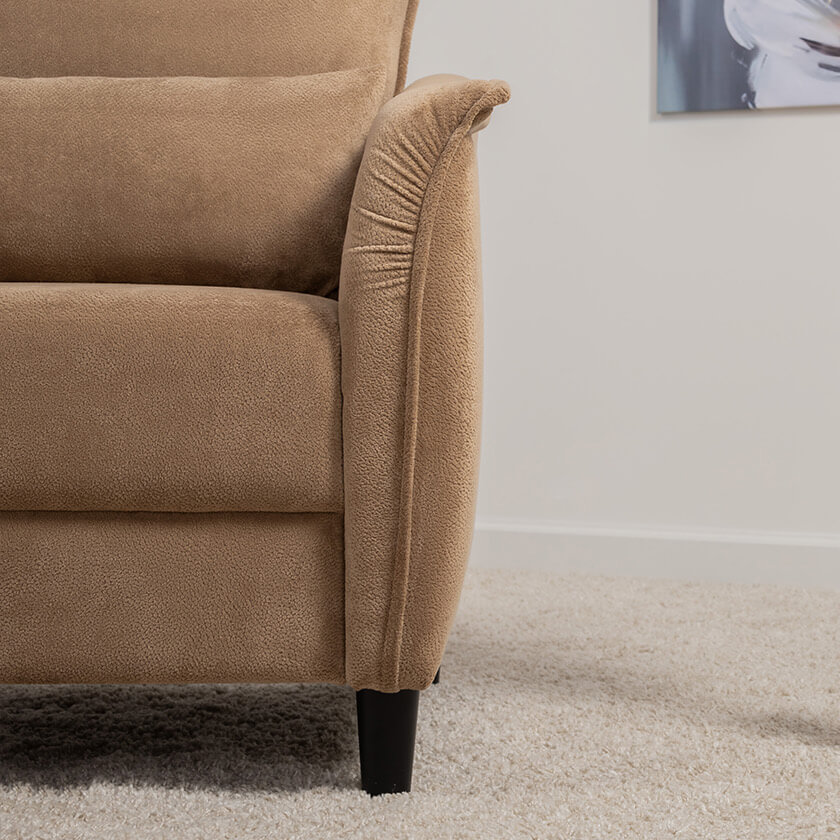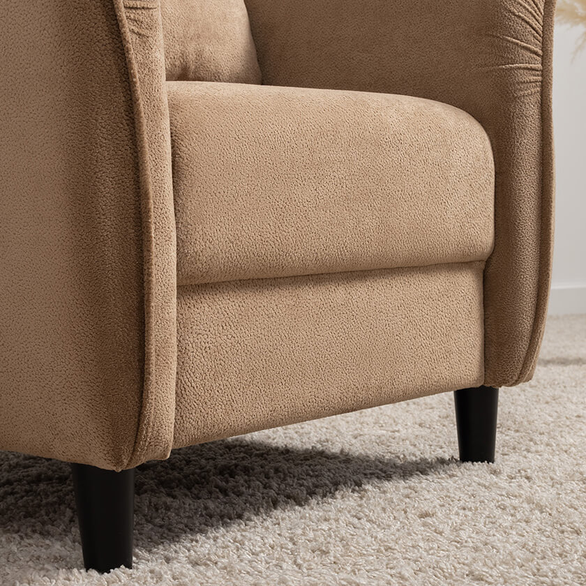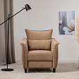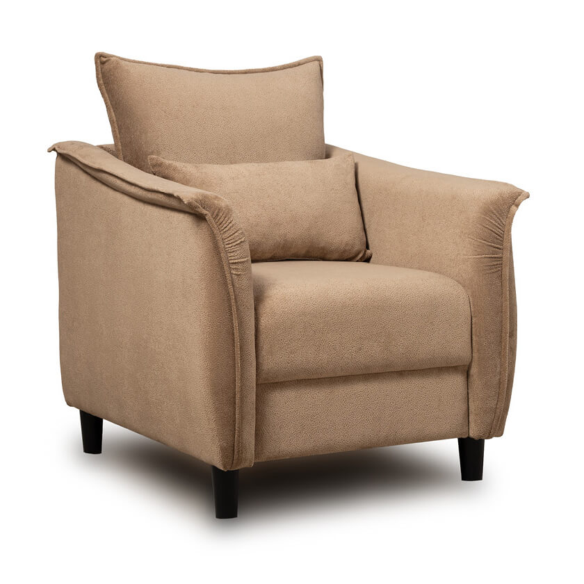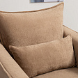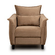Кресло с приспинной подушкой трапецивидной формы на молнии, по трем сторонам которой проложена отделочная строчка на 1,2 см. По контуру боковин проложен декоративный кант на 1,2 см основной ткани. Кант проходит по центру передней части боковины, а по внутренней верхней части сборка.