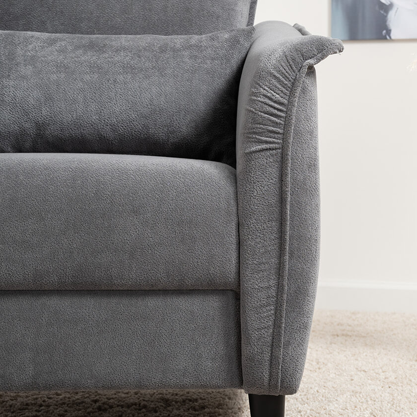 Кресло с приспинной подушкой трапецивидной формы на молнии, по трем сторонам которой проложена отделочная строчка на 1,2 см. По контуру боковин проложен декоративный кант на 1,2 см основной ткани. Кант проходит по центру передней части боковины, а по внутренней верхней части сборка.