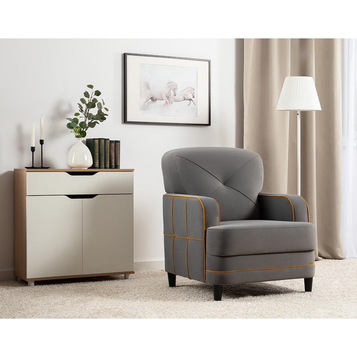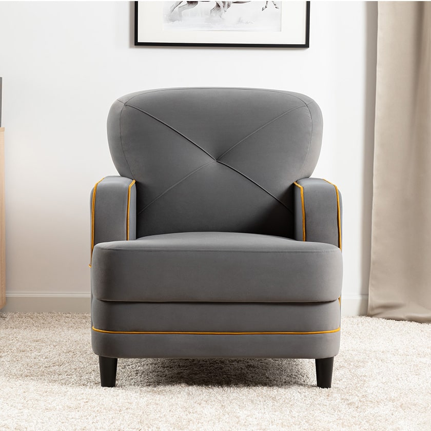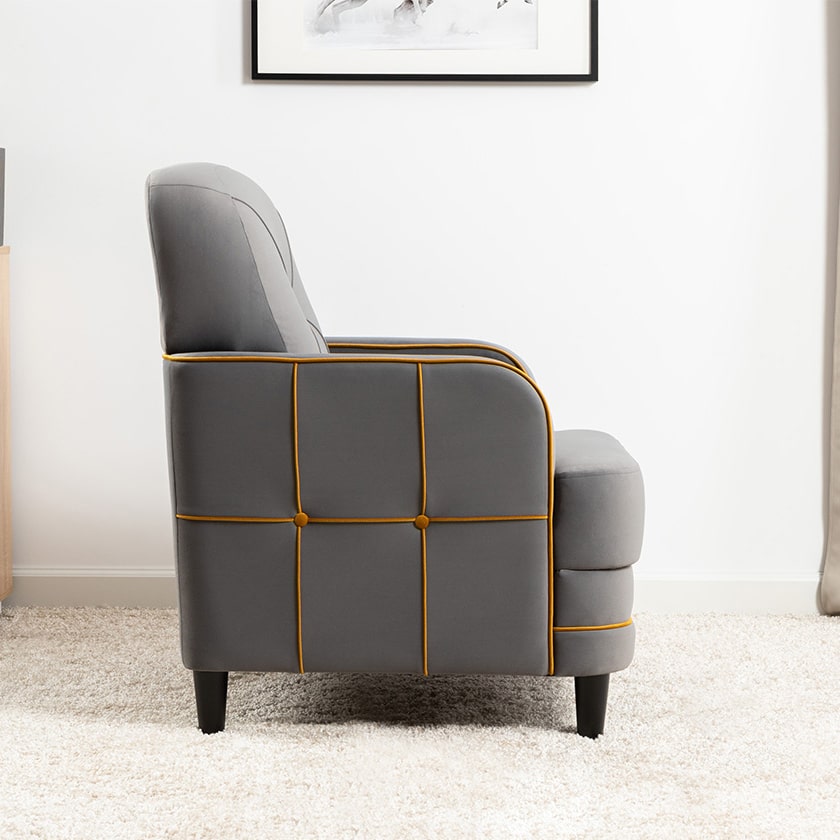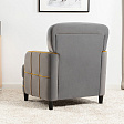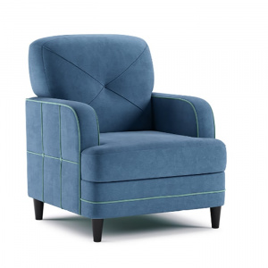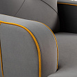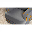 Декоративные канты на вставке подлокотников. Пуговицы в местах пересечения кантов на подушке и вставке подлокотников. По торцам подлокотников и думках контрастный декоративный кант. Защипы на сиденье и подушке.