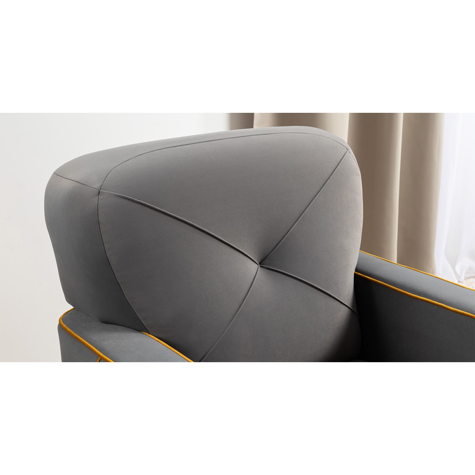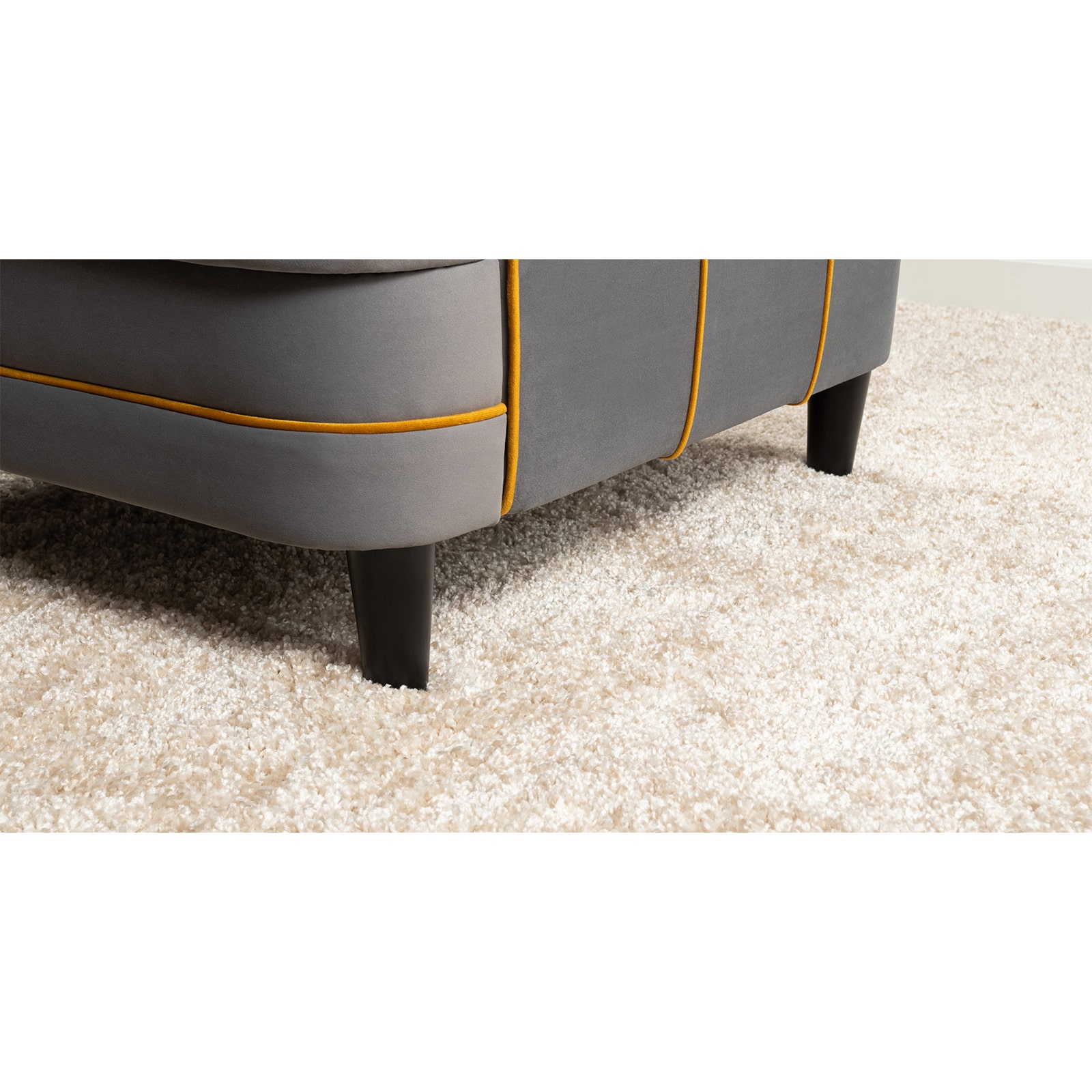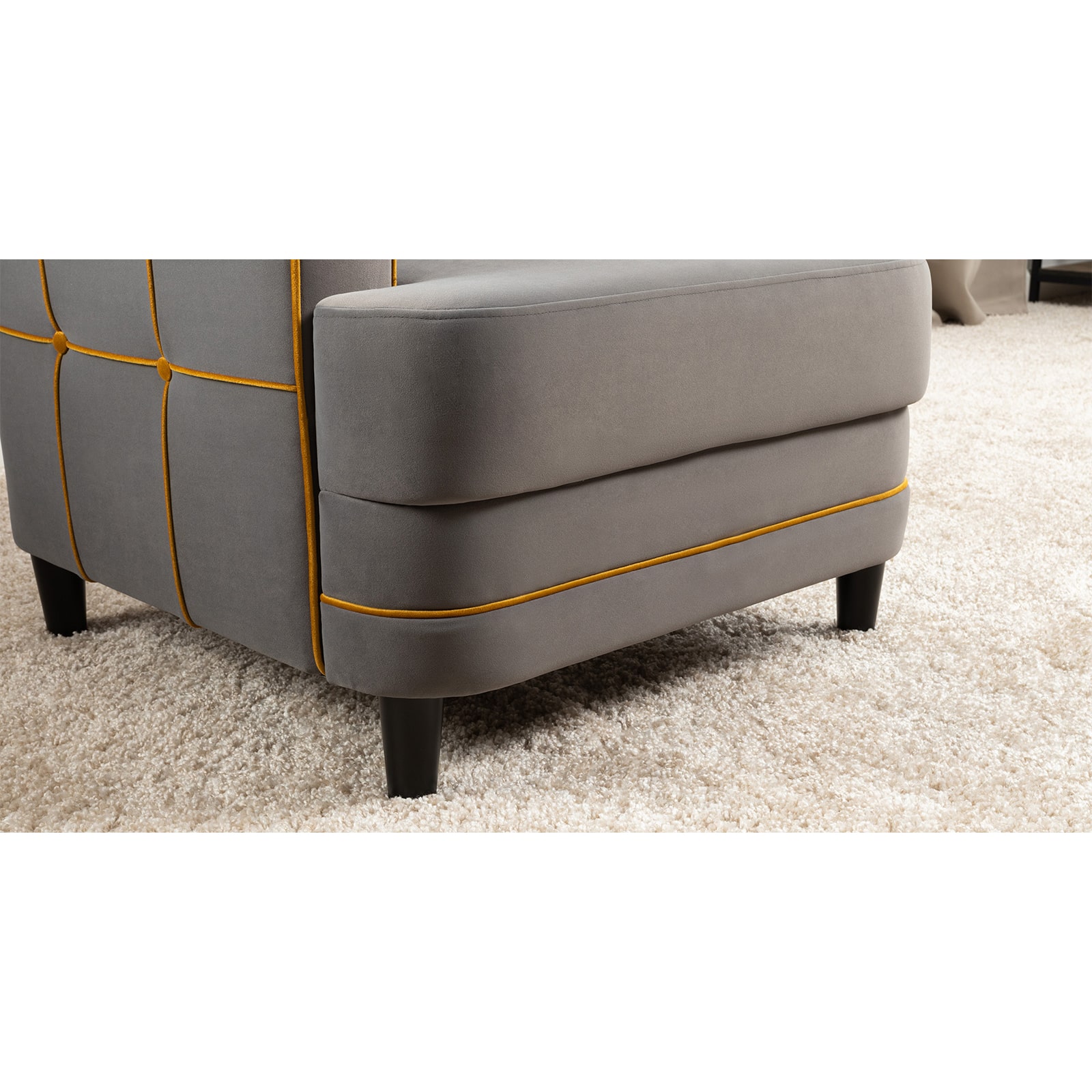 Декоративные канты на вставке подлокотников. Пуговицы в местах пересечения кантов на подушке и вставке подлокотников. По торцам подлокотников и думках контрастный декоративный кант. Защипы на сиденье и подушке.