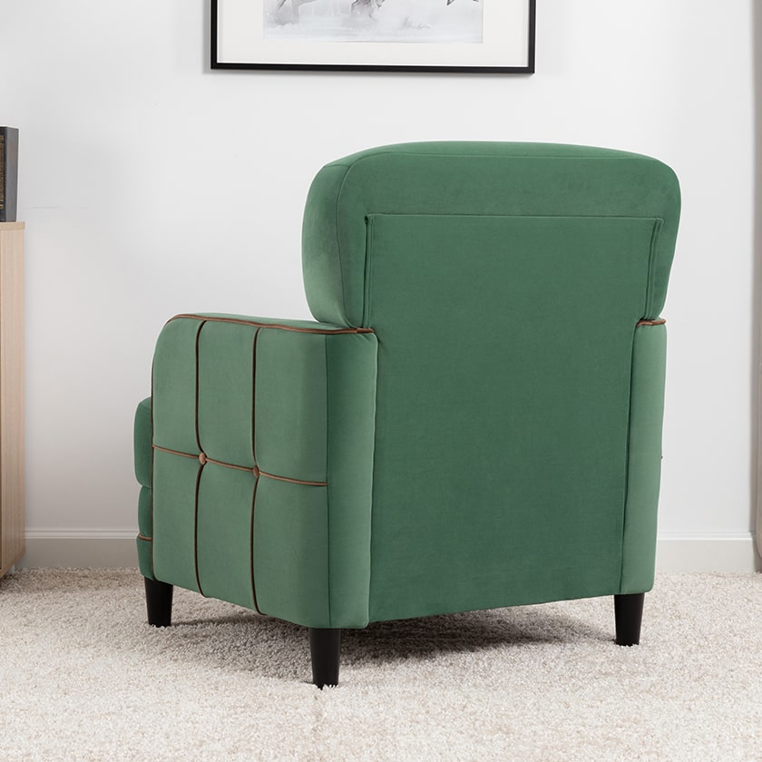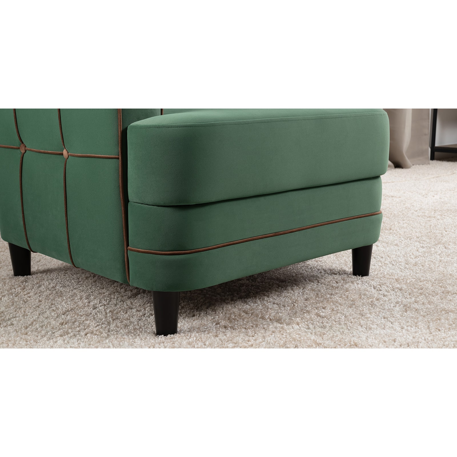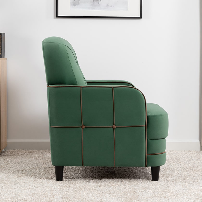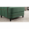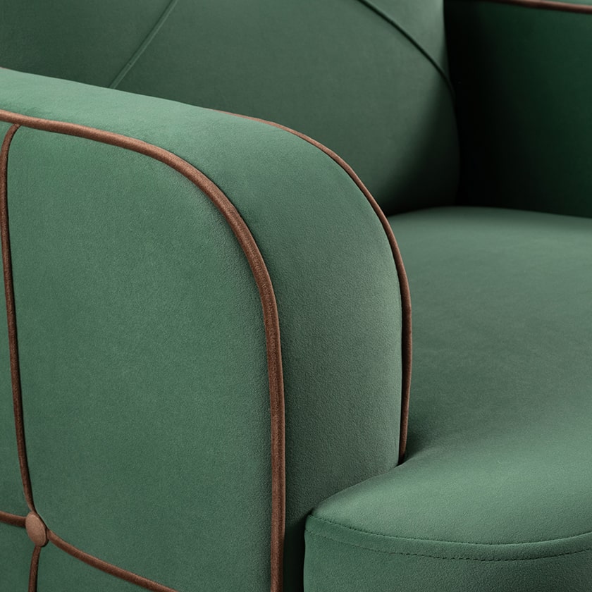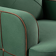 Декоративные канты на вставке подлокотников. Пуговицы в местах пересечения кантов на подушке и вставке подлокотников. По торцам подлокотников и думках контрастный декоративный кант. Защипы на сиденье и подушке.