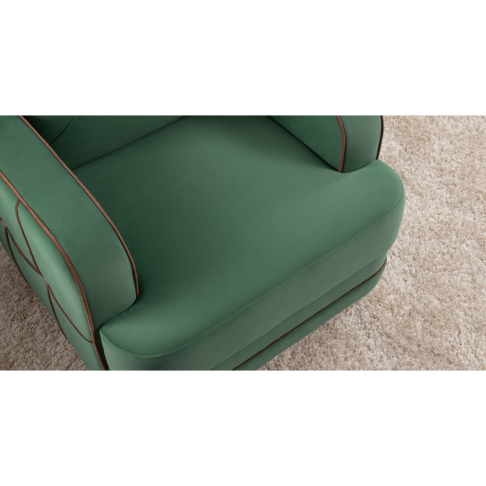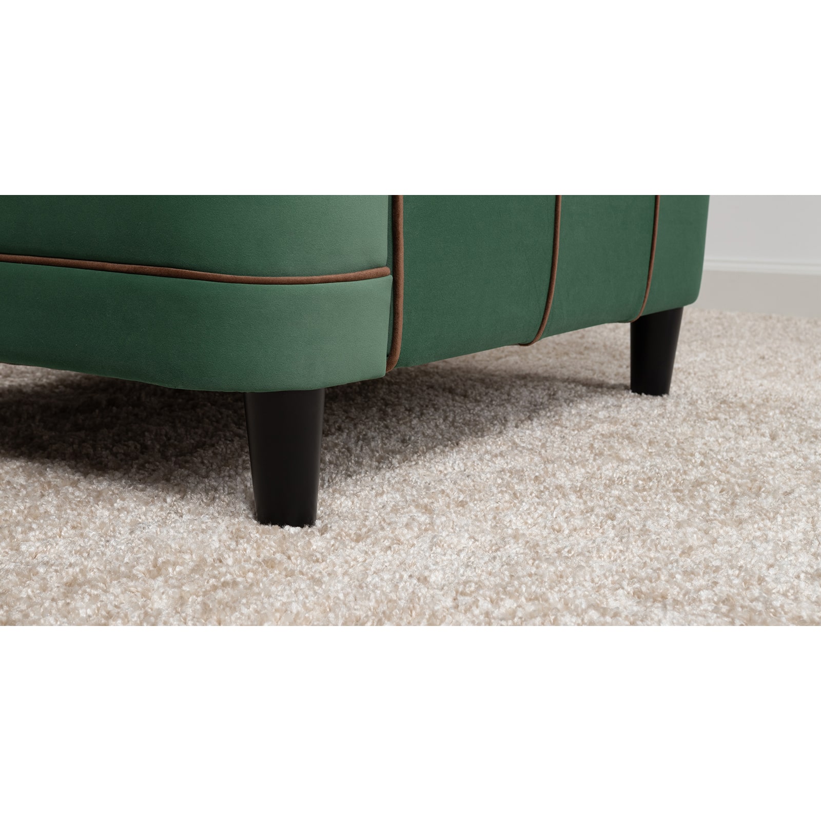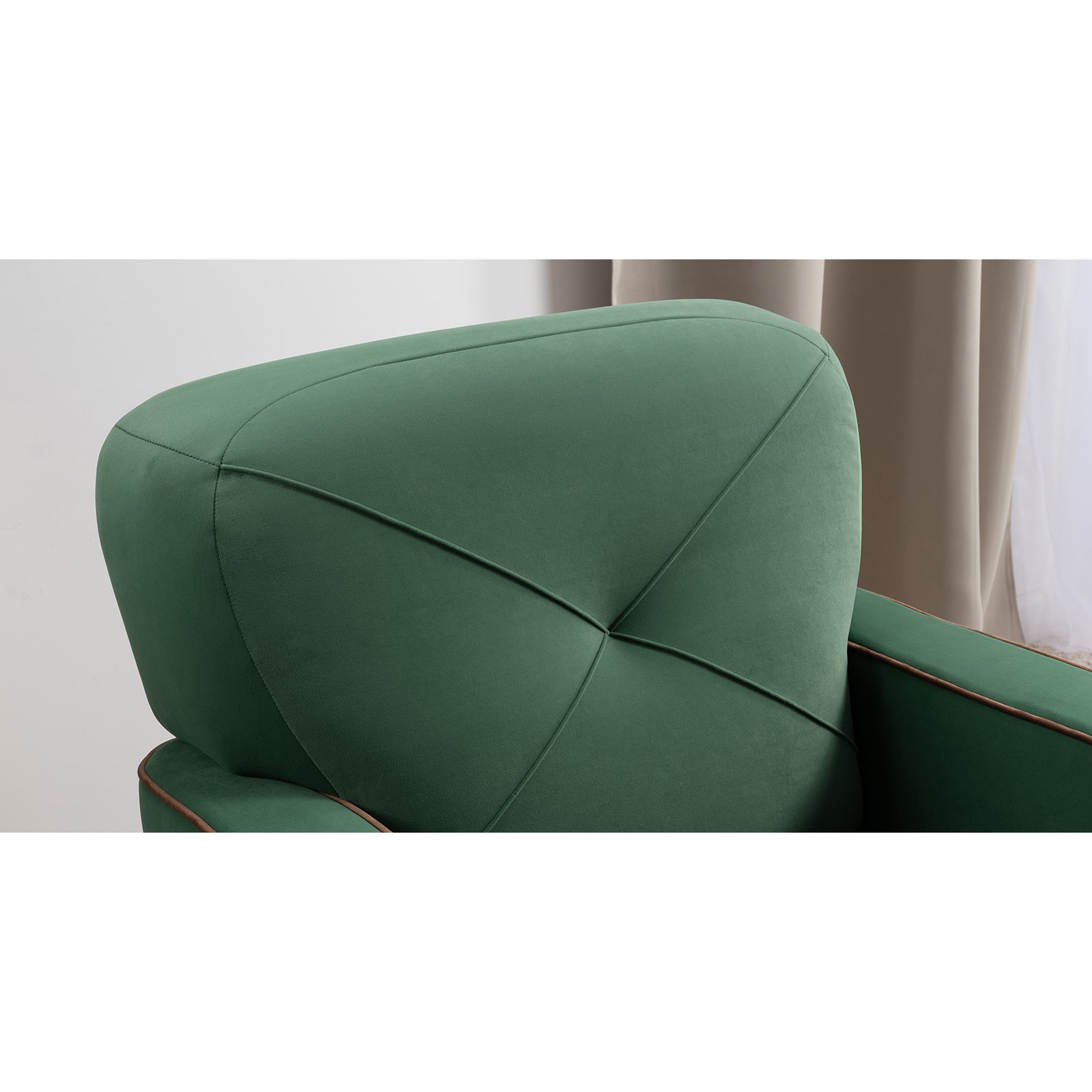 Декоративные канты на вставке подлокотников. Пуговицы в местах пересечения кантов на подушке и вставке подлокотников. По торцам подлокотников и думках контрастный декоративный кант. Защипы на сиденье и подушке.