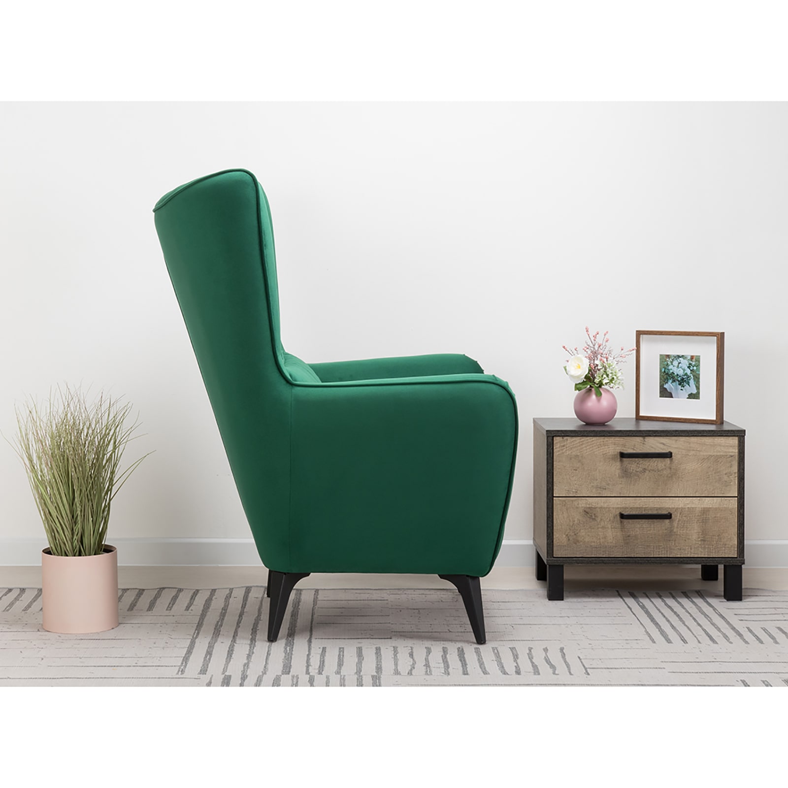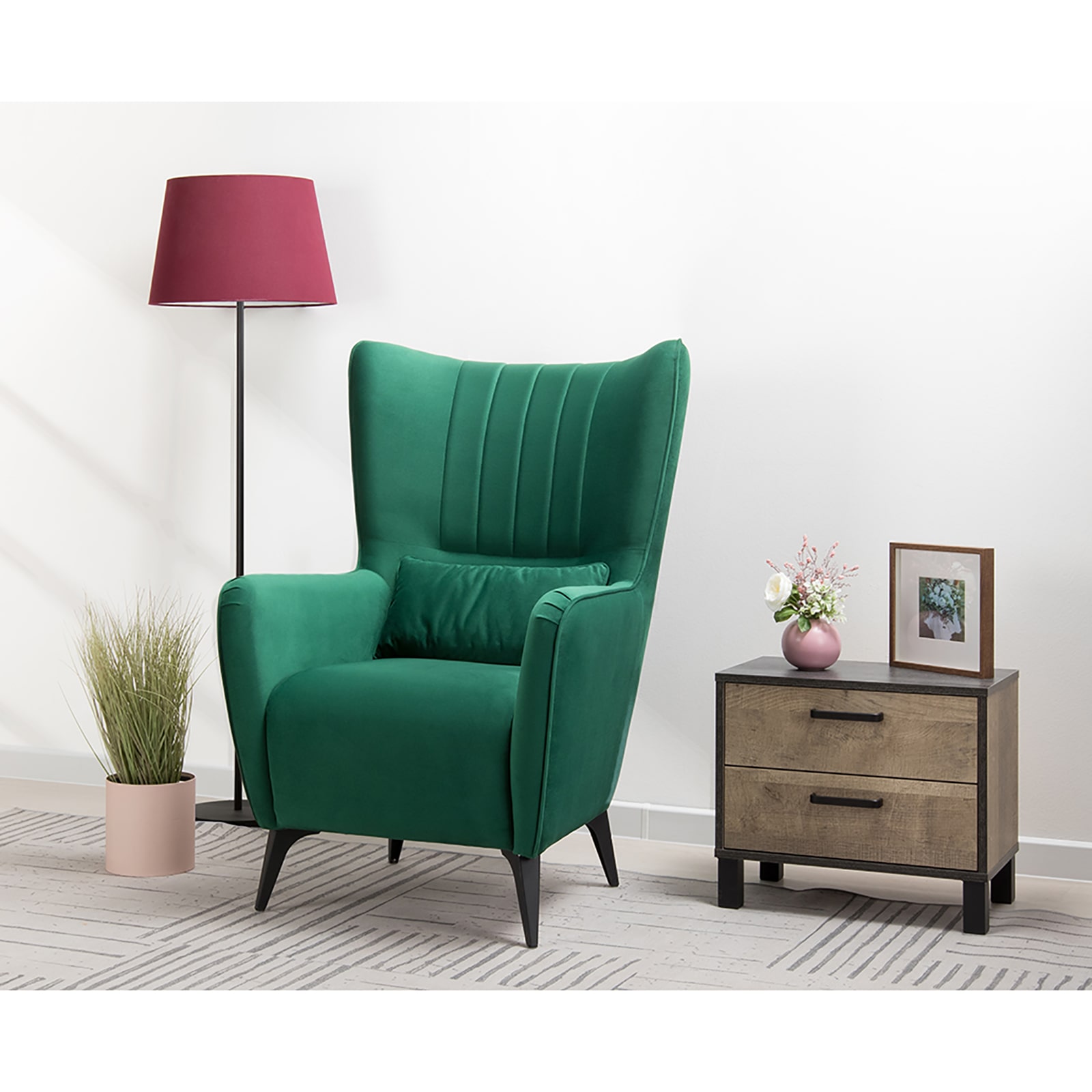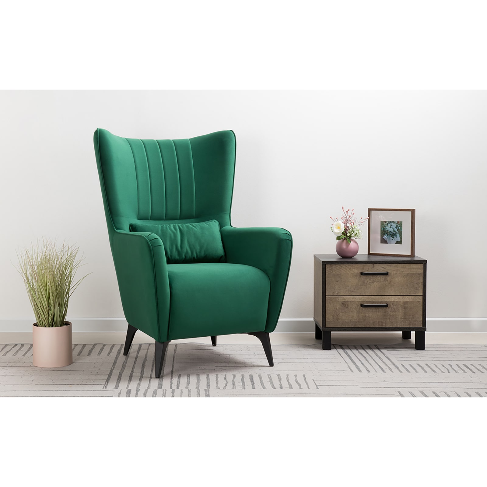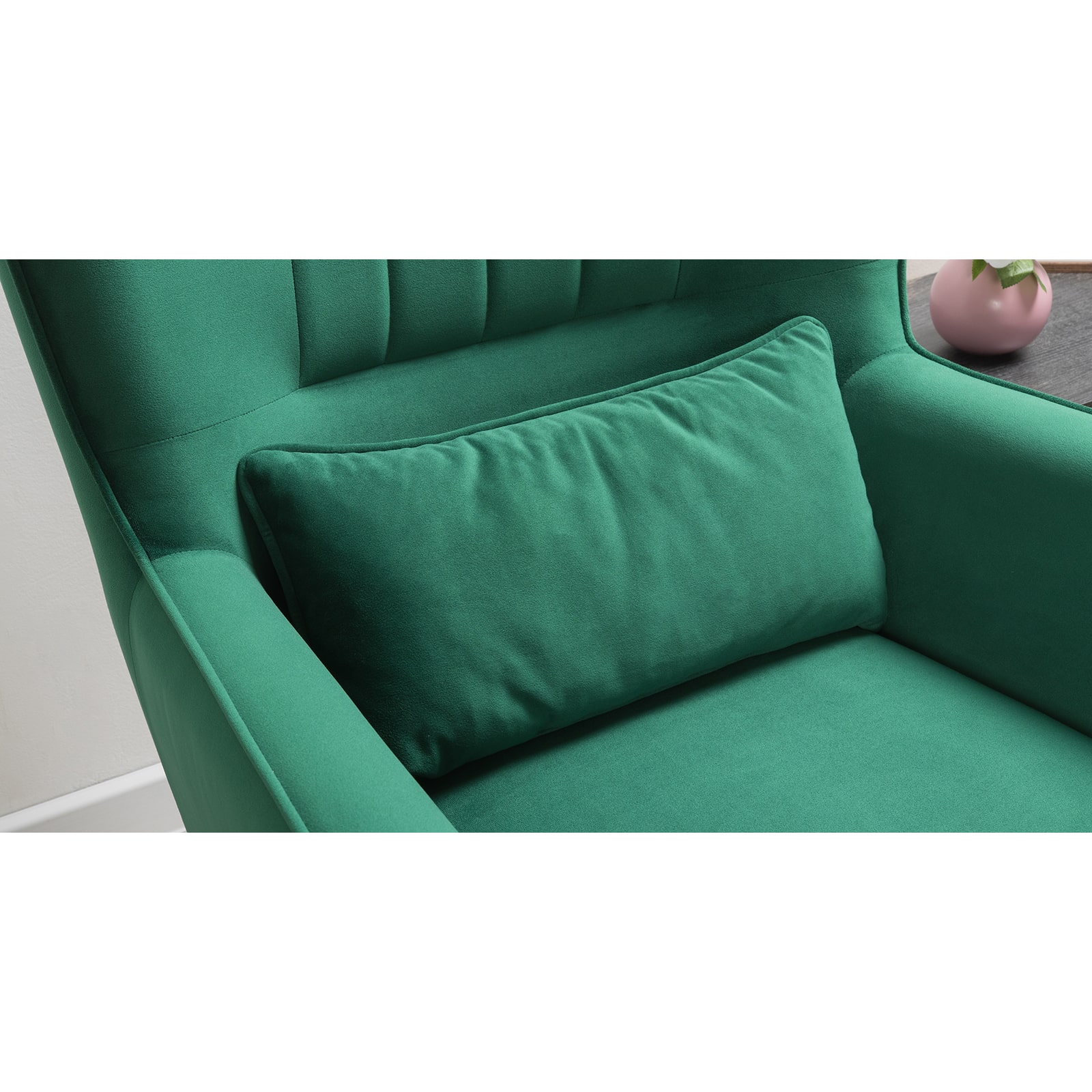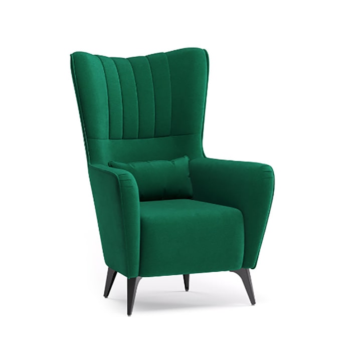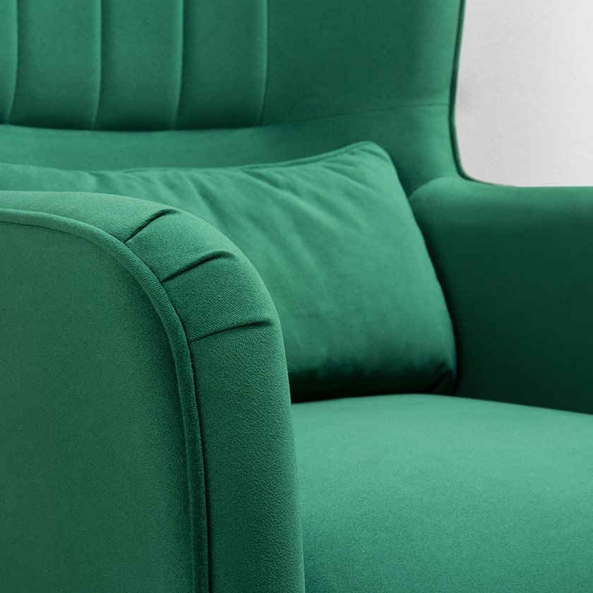 Декор: вертикальная объемная стежка в средней части спинки; кант на спинке, подлокотниках и декоративной подушке.