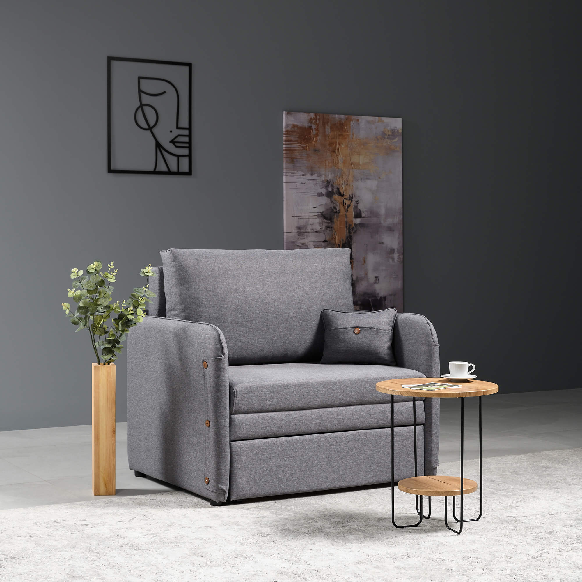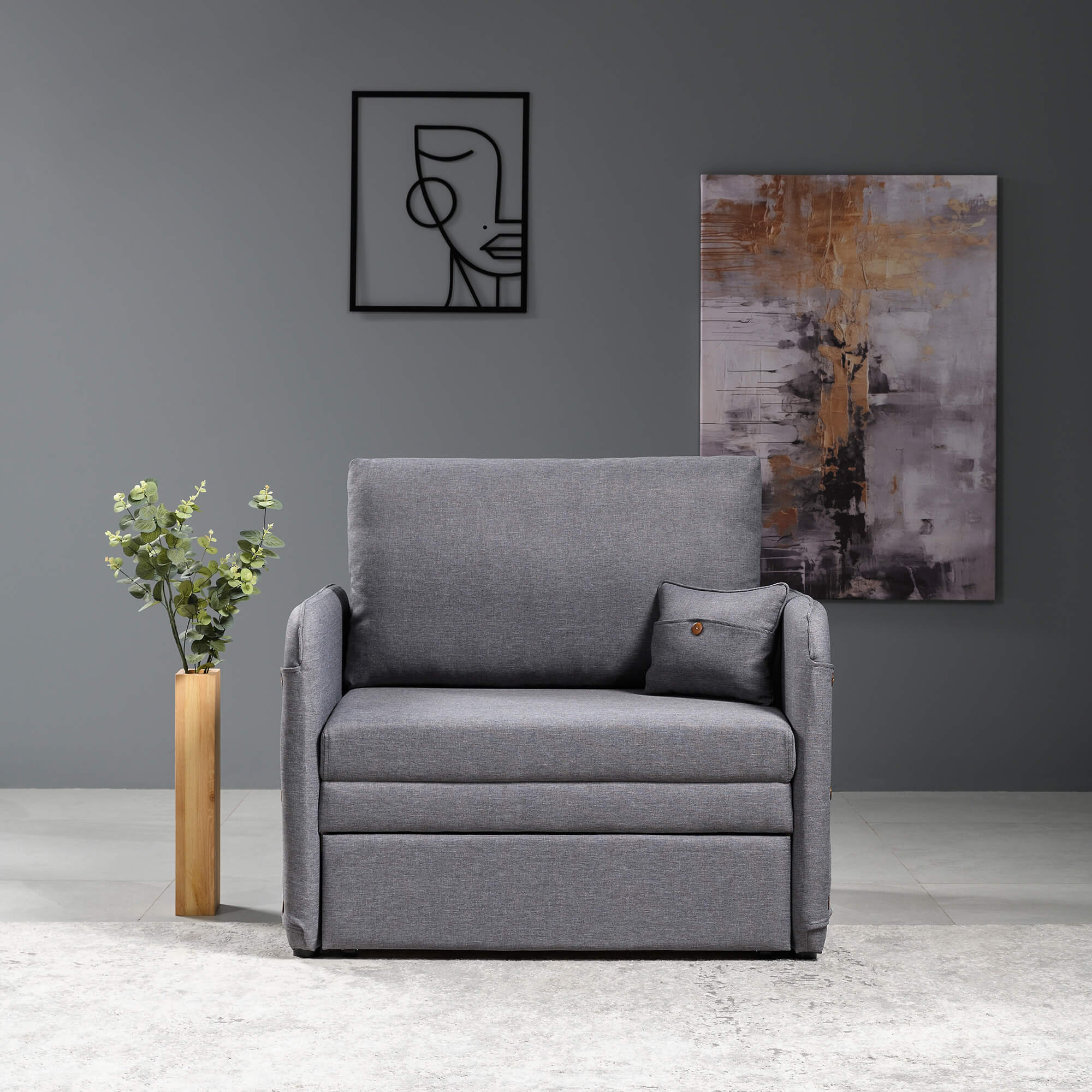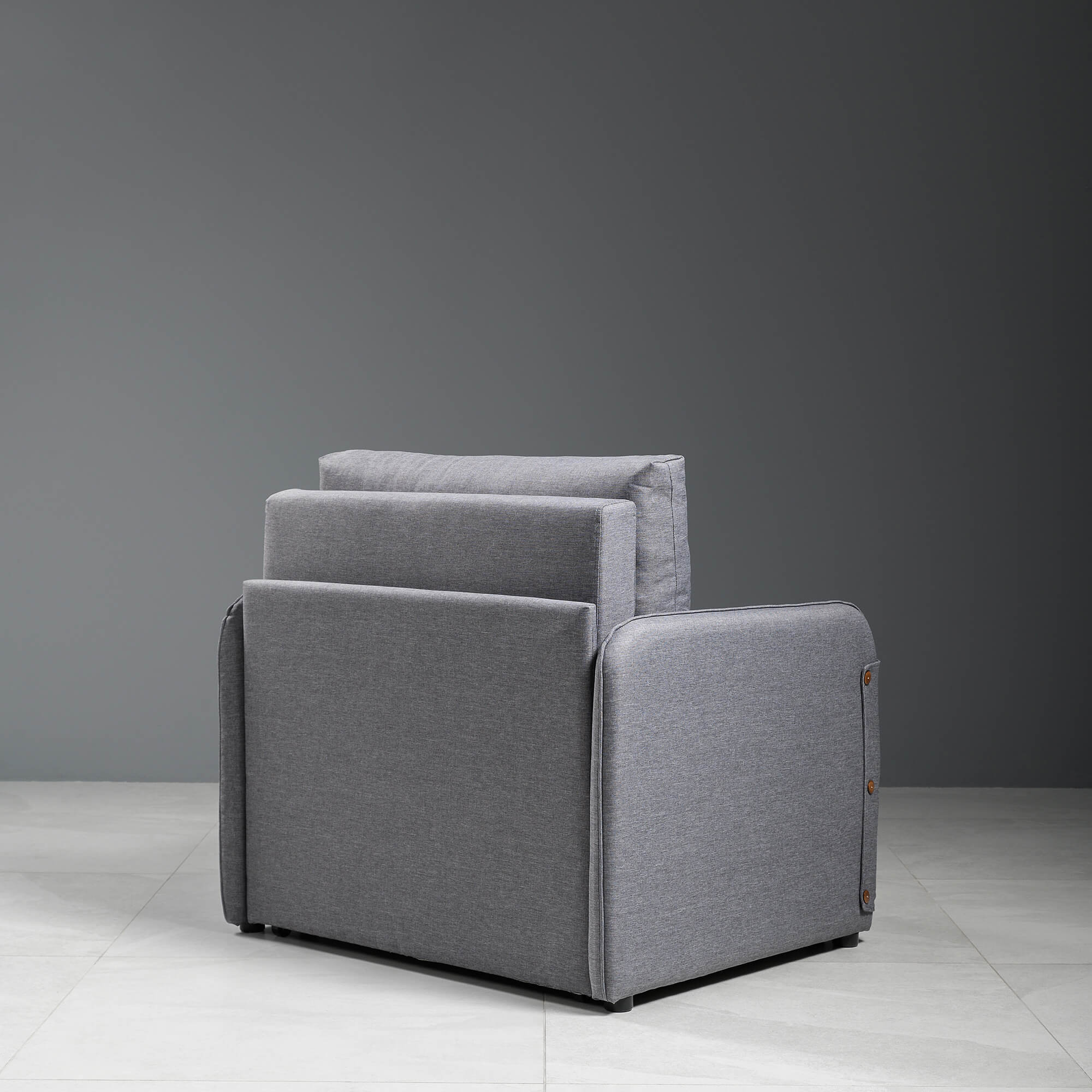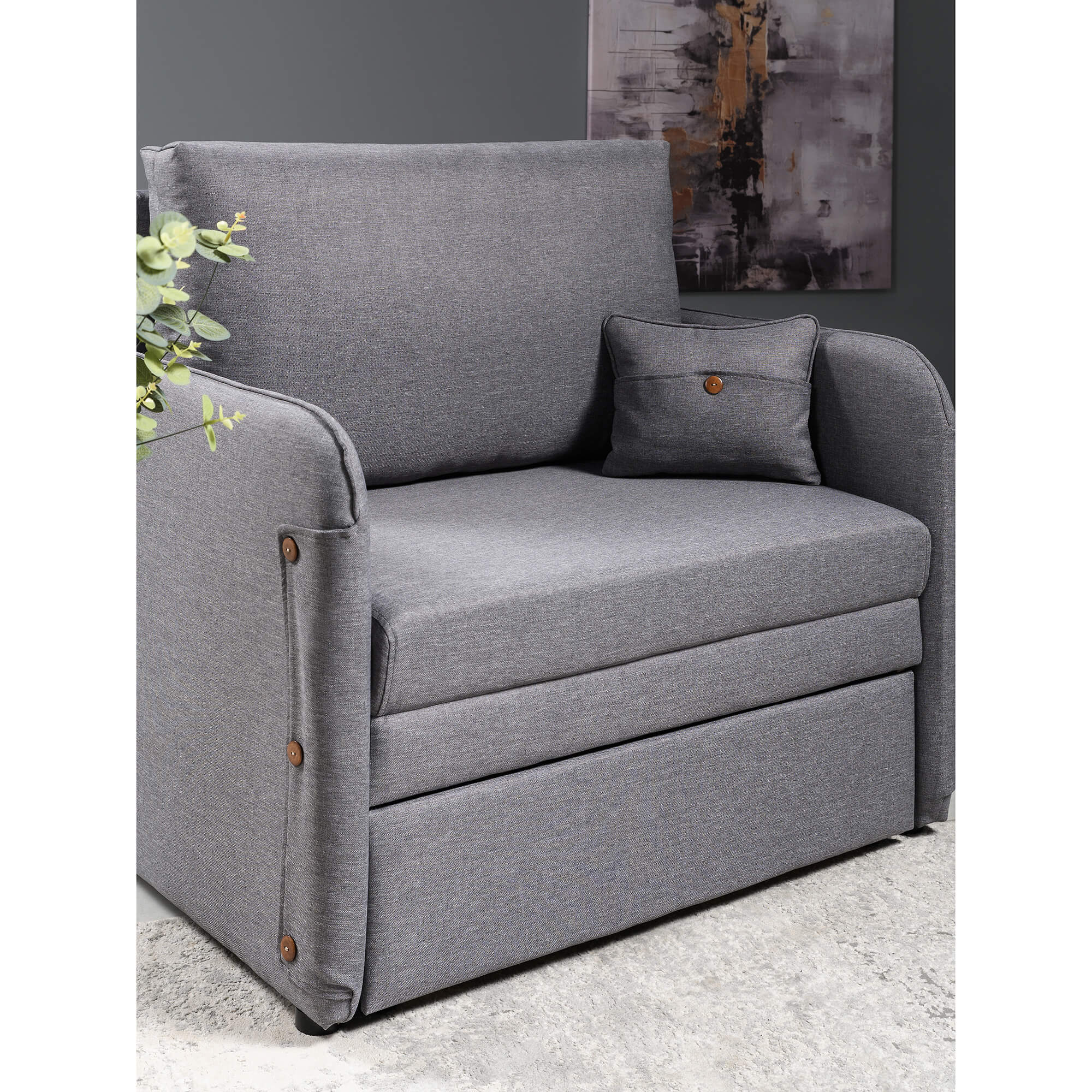Подушки со съемным чехлом обеспечат уровень комфорта, а рогожка, из которого выполнена обивка, сохранит первоначальный вид и цвет на года. Прочные механизмы превращения интерьерного кресла в кровать обеспечат легкую трансформацию. Спинка кресла с подлокотниками выполнена в основной ткани это моментальное зонирование пространства.