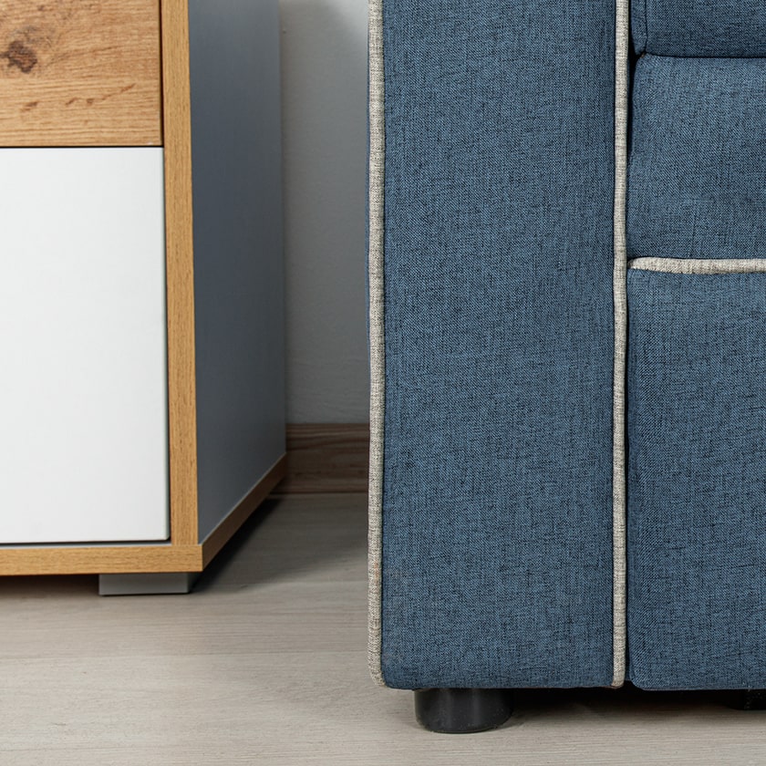 Декоративный контрастный кант по торцу спинки, торцу подлокотника, по верхнему срезу царги. Утяжки с пуговицами на спинке дивана. Две декоративные подушки в контрастной ткани.