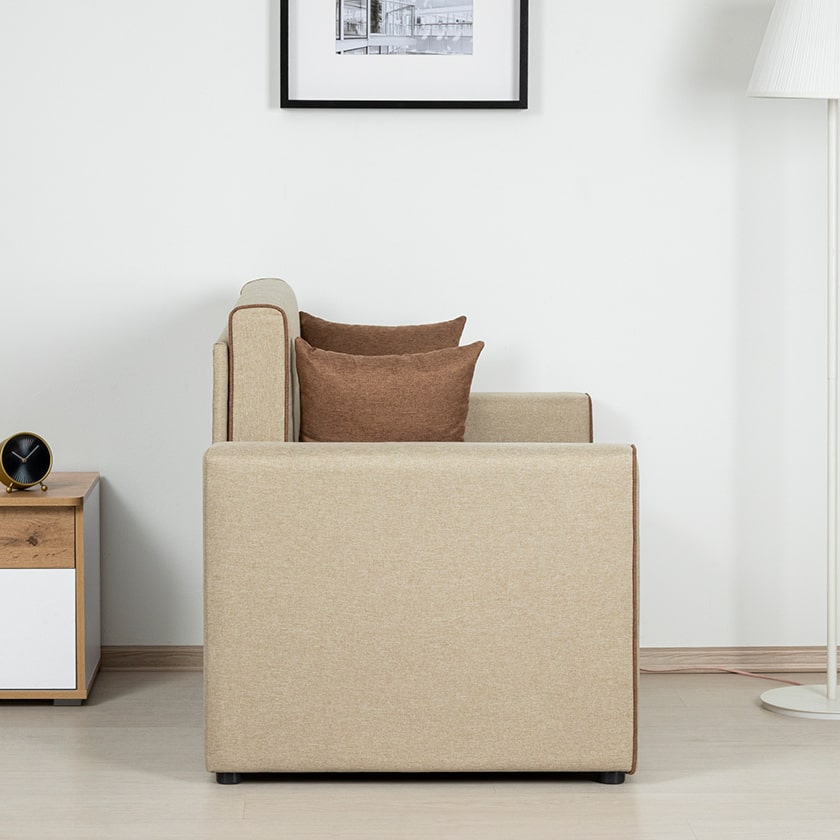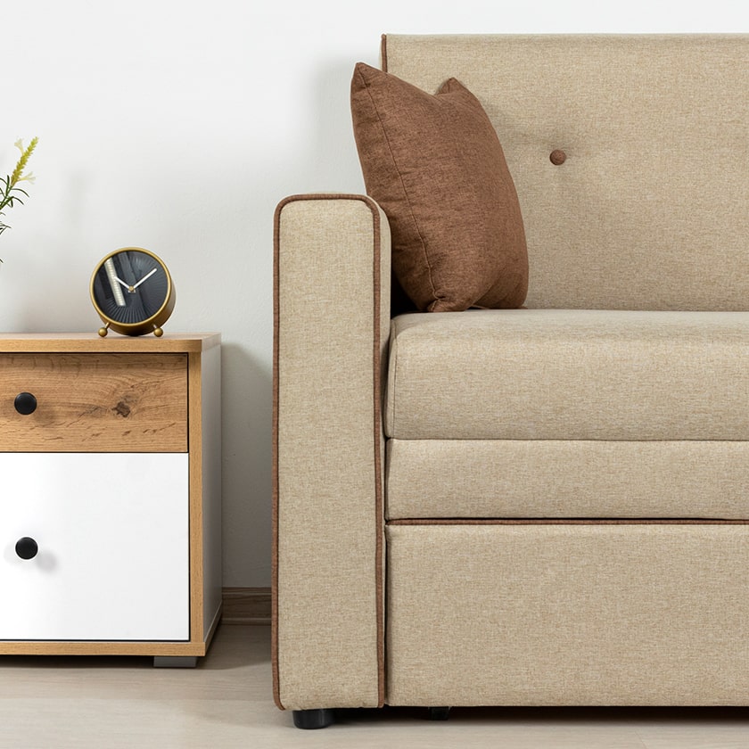 Декоративный контрастный кант по торцу спинки, торцу подлокотника, по верхнему срезу царги. Утяжки с пуговицами на спинке дивана. Две декоративные подушки в контрастной ткани.