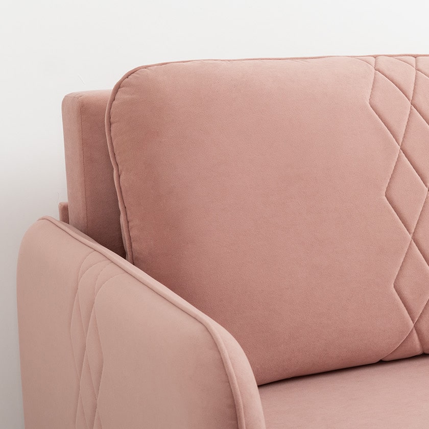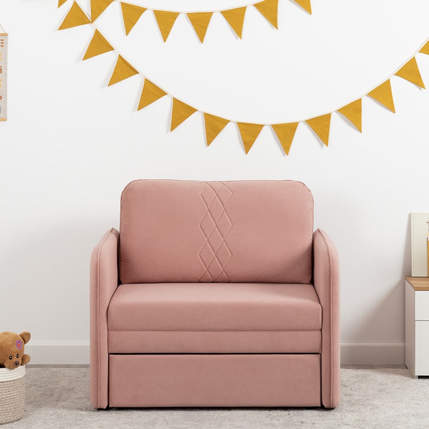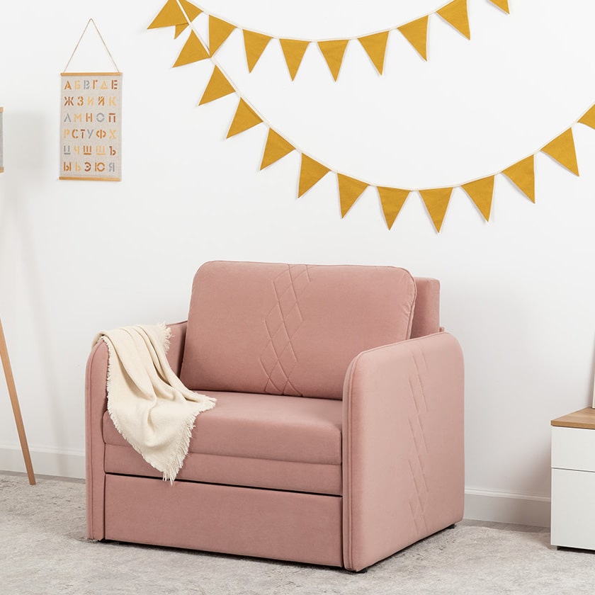 Стильный компактный диван для детской и гостиной. При своих скромных размерах он трансформируется в полноценное спальное место для детей и подростков. Лаконичный дизайн в виде декоративной отстрочки подчеркивает фактуру велюра, а небольшие размеры позволят разместить его в любом пространстве.