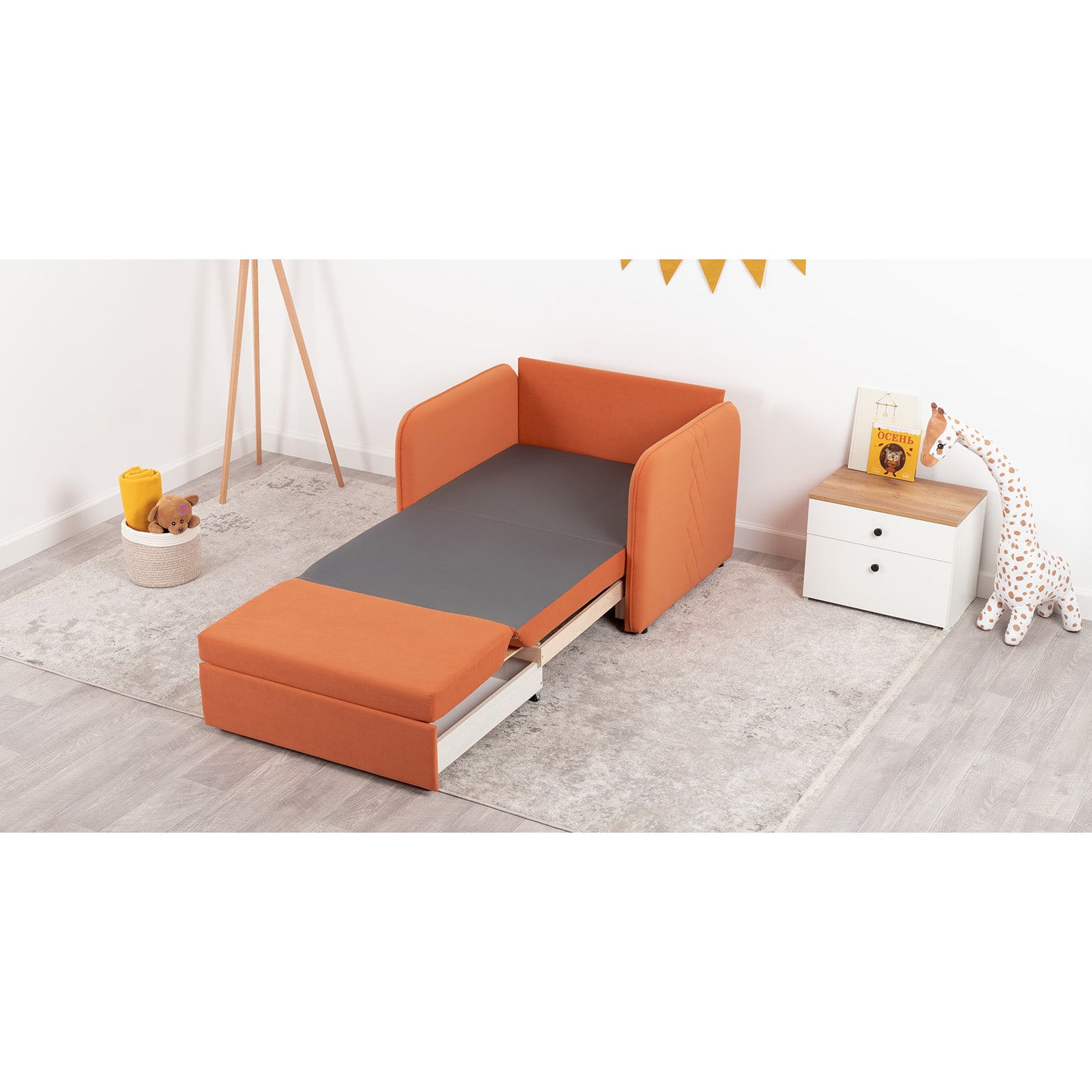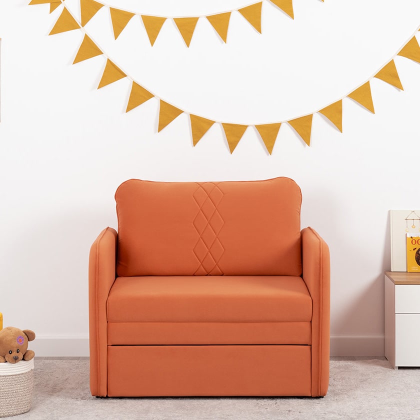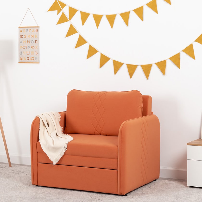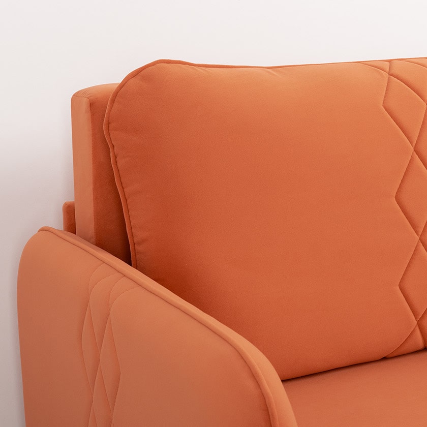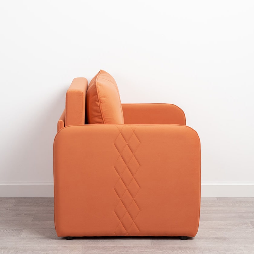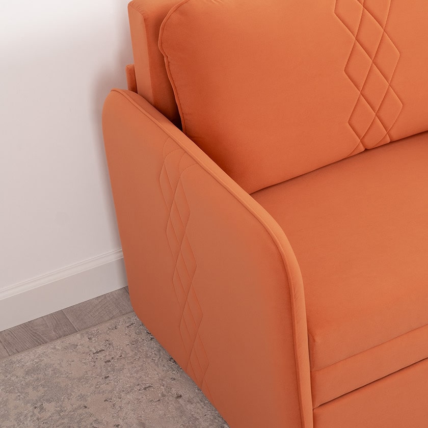 Стильный компактный диван для детской и гостиной. При своих скромных размерах он трансформируется в полноценное спальное место для детей и подростков. Лаконичный дизайн в виде декоративной отстрочки подчеркивает фактуру велюра, а небольшие размеры позволят разместить его в любом пространстве.