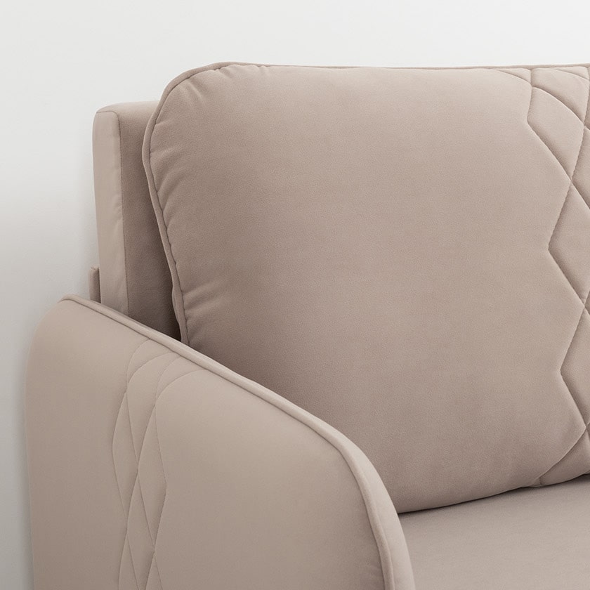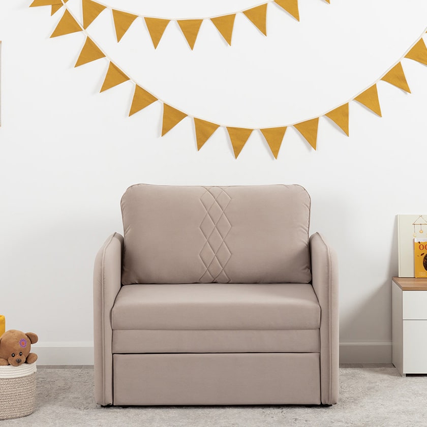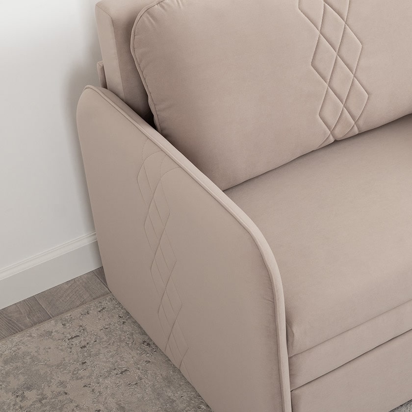 Стильный компактный диван для детской и гостиной. При своих скромных размерах он трансформируется в полноценное спальное место для детей и подростков. Лаконичный дизайн в виде декоративной отстрочки подчеркивает фактуру велюра, а небольшие размеры позволят разместить его в любом пространстве.