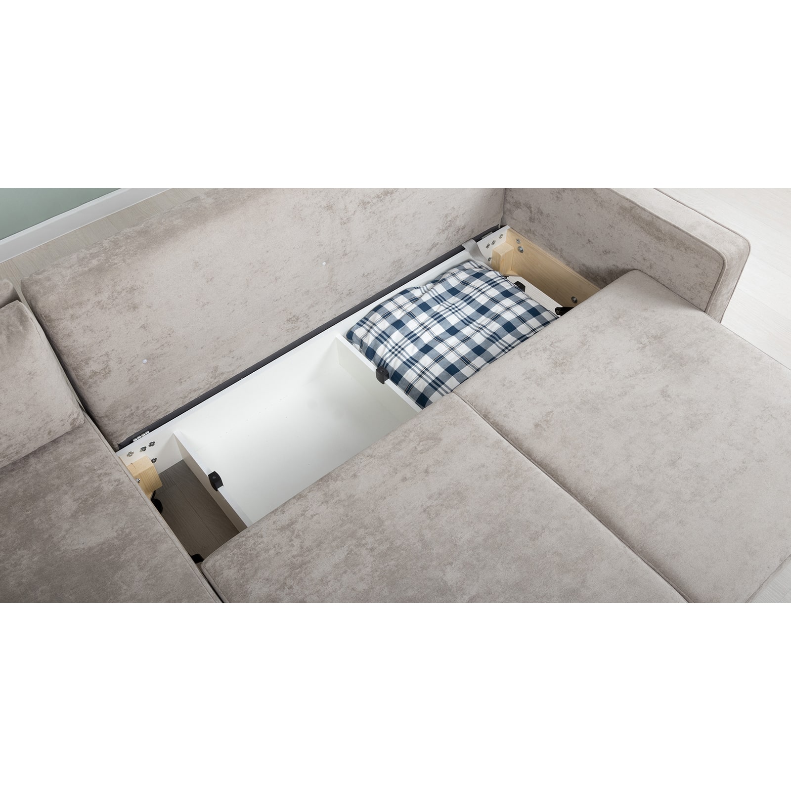 Бельевой ящик: в диванной части с перегородкой по центру (2 отделения), размер отделения - 820х675х150 мм; в оттоманке (2 отделения), размер отделения: 710х675х150 мм.