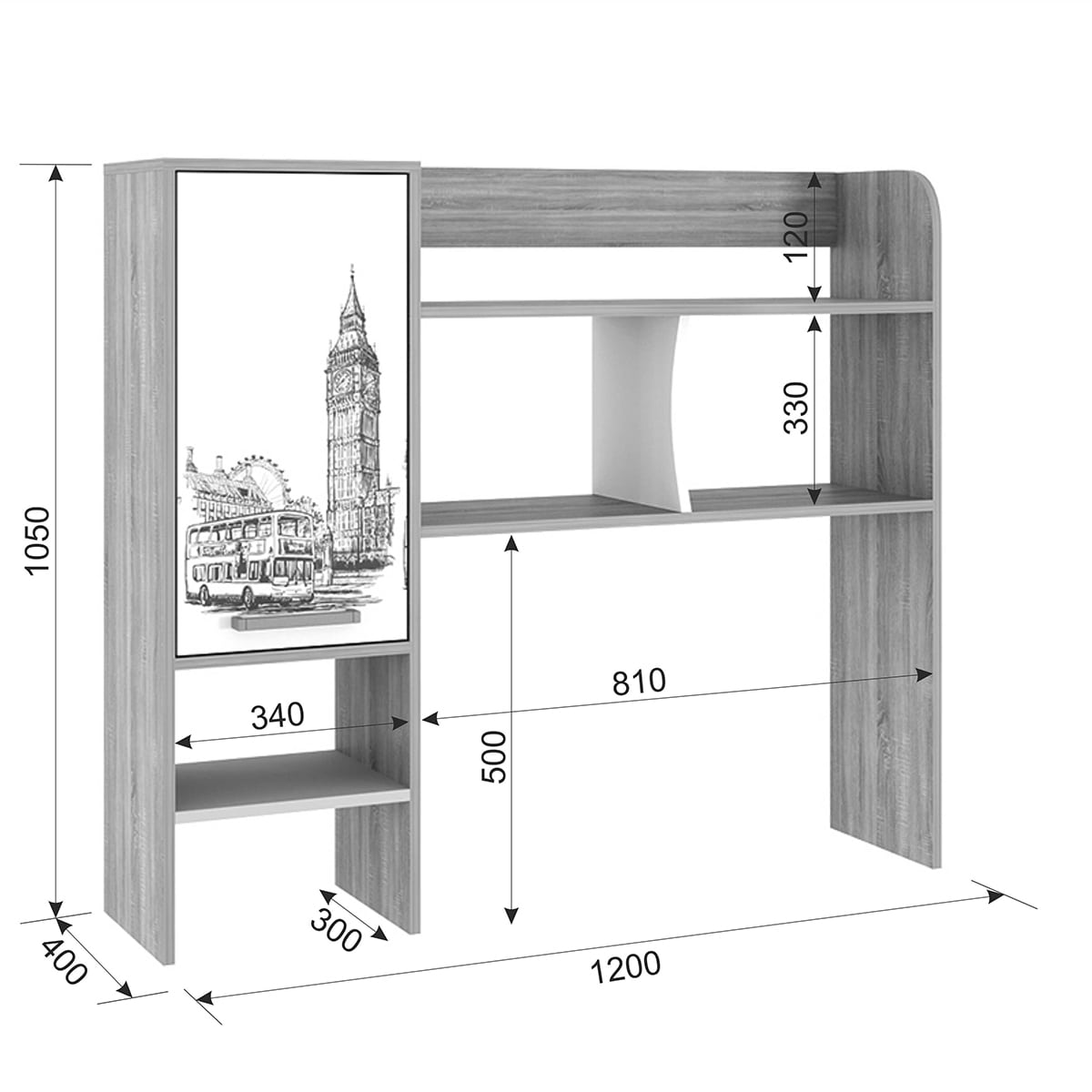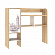 Данная надстройка оборудована вместительными полками, предназначенными для хранения книг, учебников, папок и другой необходимой документации. Также на этих полках можно разместить офисную технику, такую как сканер или принтер. Особенностью дизайна является фасад закрытой ниши с оригинальным принтерным рисунком.