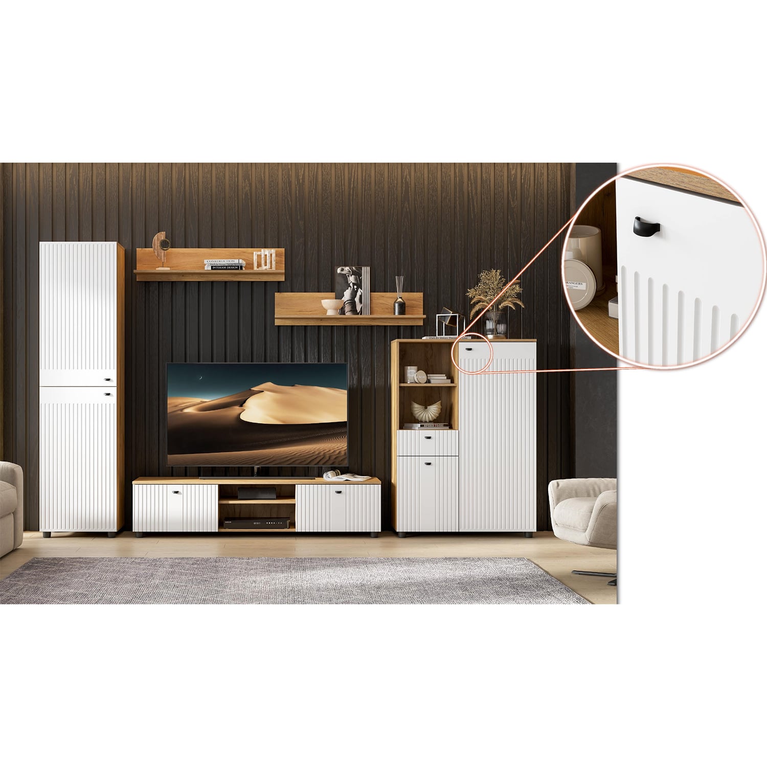 Безупречная фрезеровка фасадов подчеркивает мягкую матовую текстуру фасадов. Все это позволит сделать дизайн гостиной Милан уникальным и запоминающим.