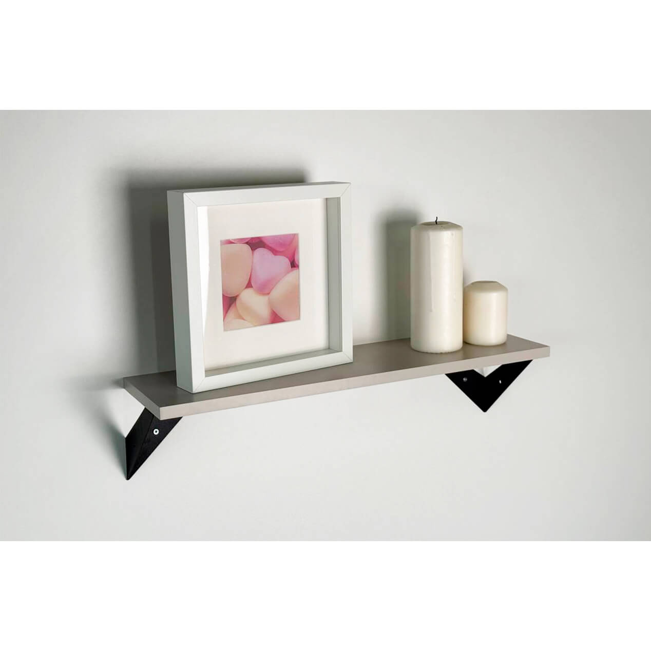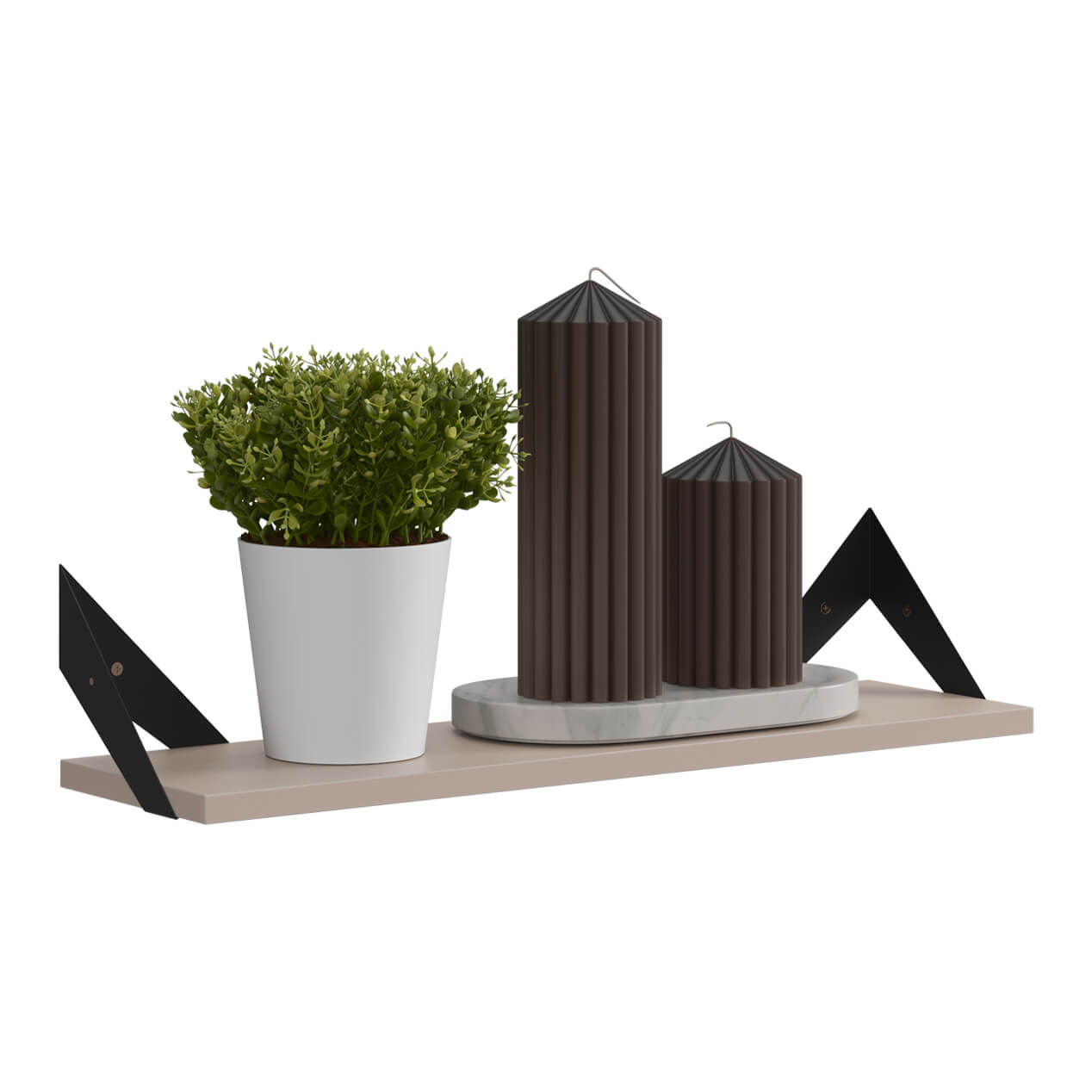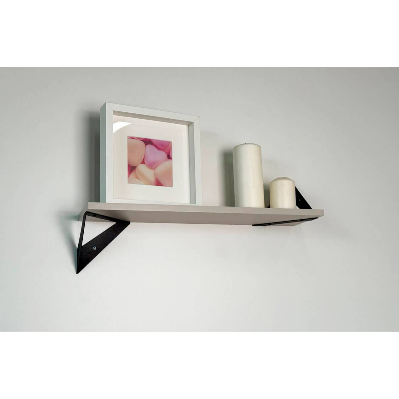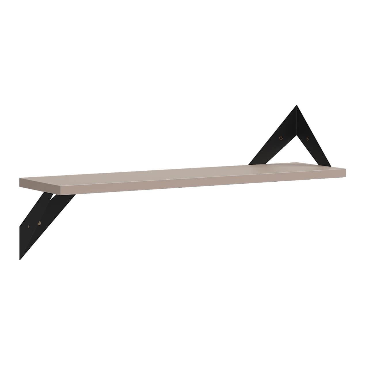 Полка крепится к стене с помощью чёрных треугольных держателей, которые обеспечивают устойчивость и долговечность. Особенность модели в том, что держатели можно расположить сверху, снизу или один сверху, другой снизу, что позволяет адаптировать полку под любые интерьерные решения и потребности.