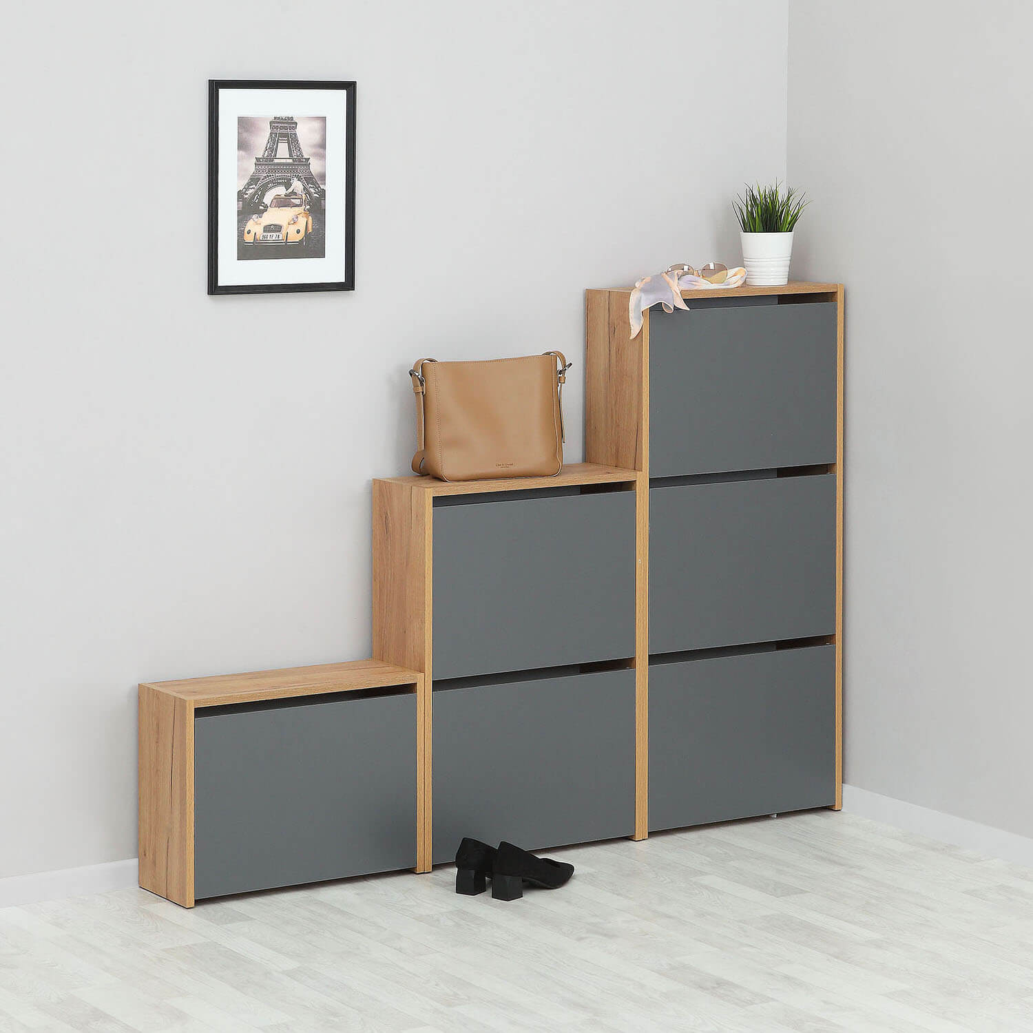 Обувница №3 придаст эстетичный вид прихожей, убережет вашу обувь от пыли и освободит пространство. Фасады без ручек, открываются за верхнюю часть.