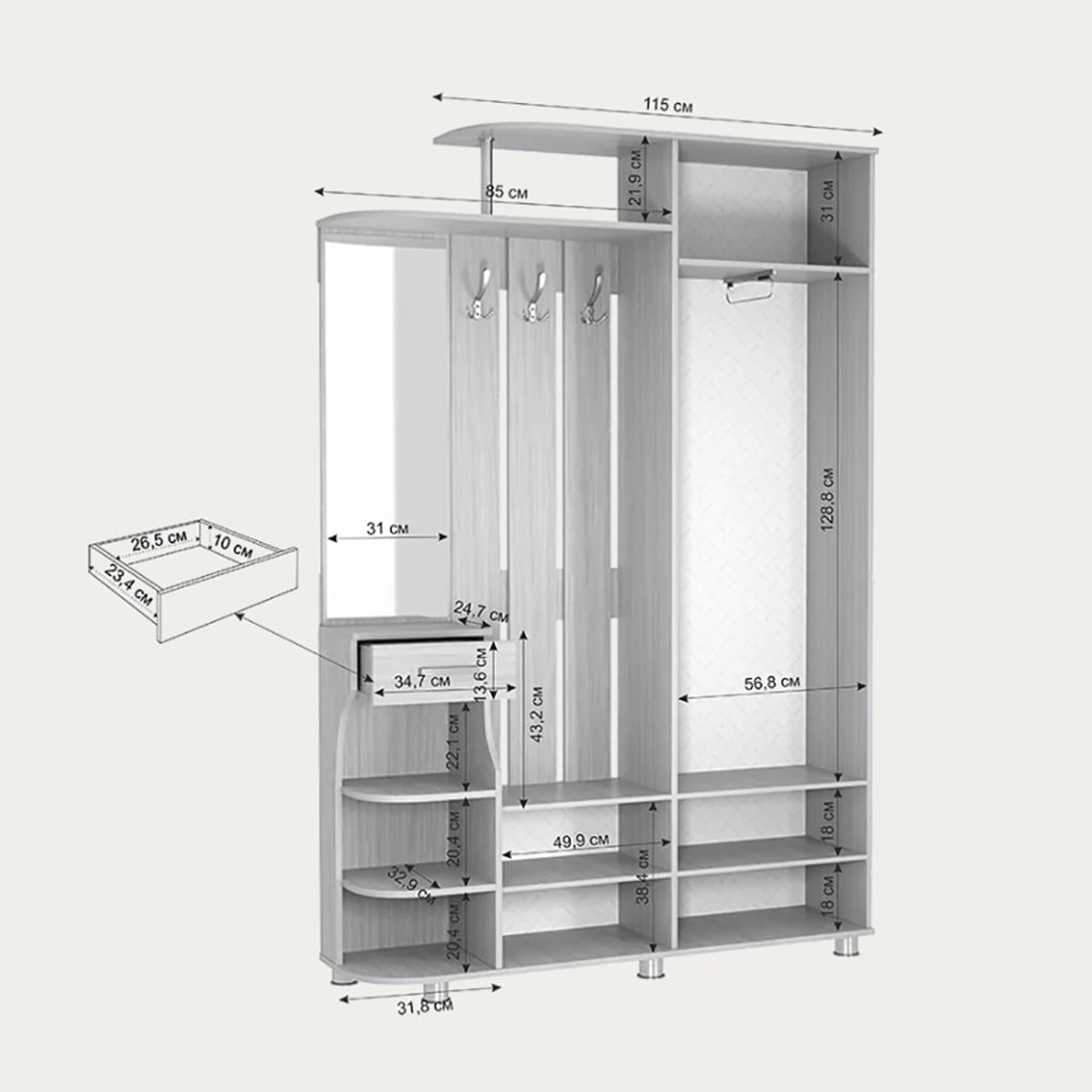 Прихожая Барселона-2: идеальное решение для максимизации пространства в вашей прихожей, объединяющее в себе все ключевые элементы для комфортного размещения одежды и аксессуаров.