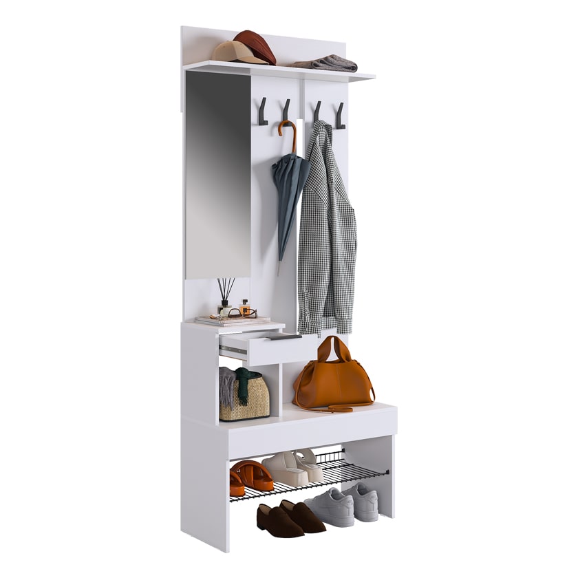 Крючки для одежды обеспечивают удобное место для размещения верхней одежды и аксессуаров, а выкатной ящик предоставляет дополнительное пространство для хранения мелочей. Сетчатая полка для обуви позволяет аккуратно разместить обувь, обеспечивая вентиляцию и легкий доступ.