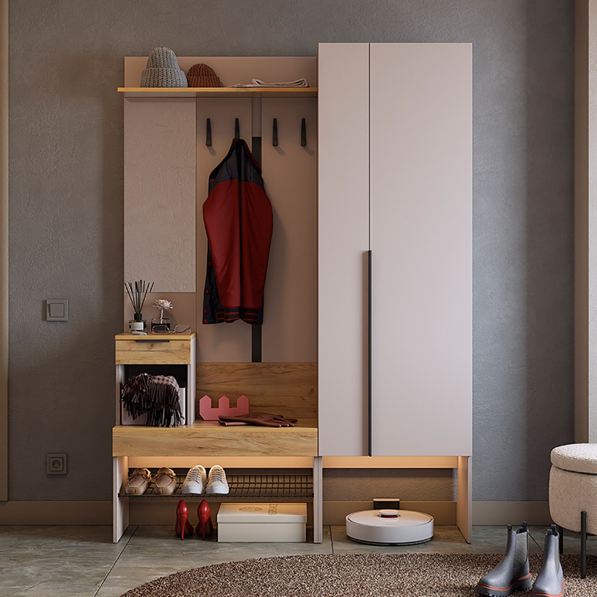 Прихожая "Баско К2" — стильное и функциональное решение для вашего дома. Эта прихожая создана для того, чтобы обеспечить удобство и порядок в вашем входном пространстве.