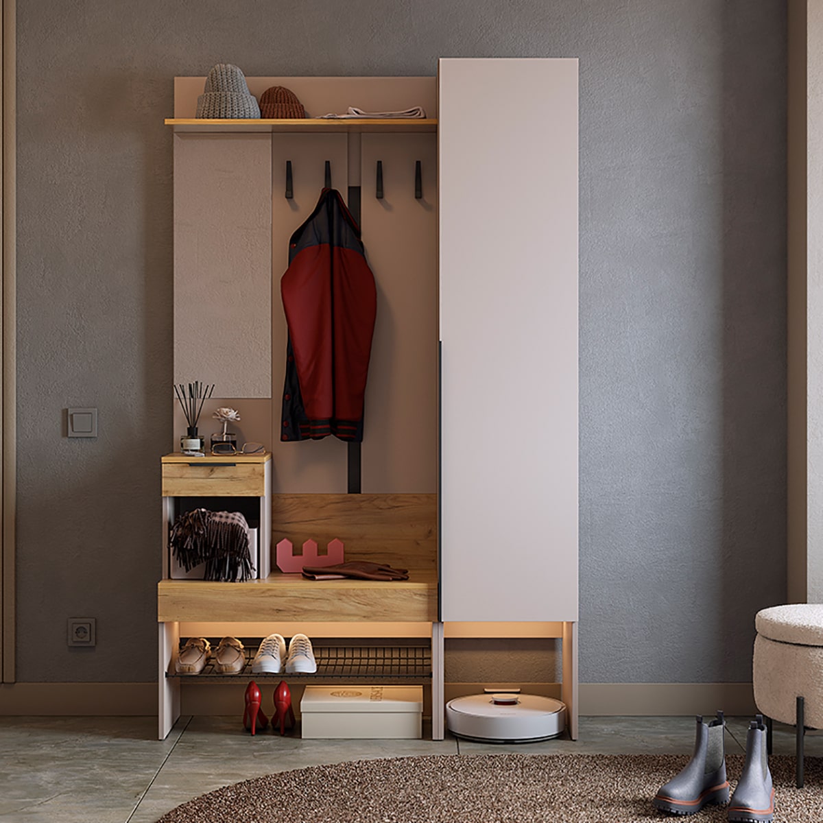 Прихожая "Баско К3" — стильное и функциональное решение для вашего дома. Эта прихожая создана для того, чтобы обеспечить удобство и порядок в вашем входном пространстве.