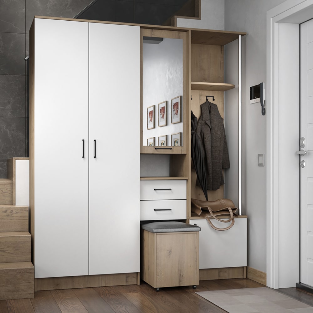 Прихожая Дуся - отличное решение для тех, кто хочет создать уютную и функциональную обстановку в своем доме. Благодаря модульным элементам, вы сможете организовать пространство вашей прихожей таким образом, чтобы максимально эффективно использовать имеющуюся площадь. Пуфик, который идет в комплекте, станет удобным местом для сидения и добавит комфорта в вашу прихожую. Небольшие размеры прихожей также делают ее идеальным выбором для маленьких помещений.