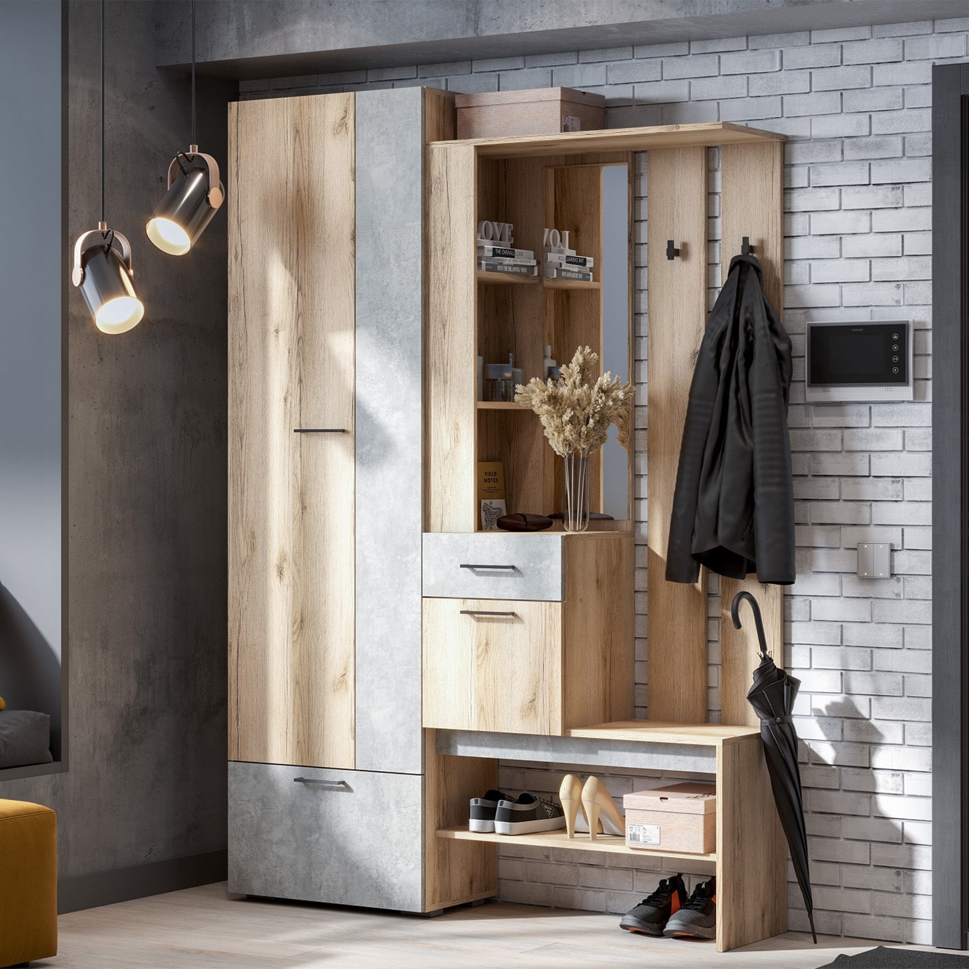 Сочетание светлого оттенка дерева и натурального цемента в Прихожей Фаворит идеально подходит для помещений, обычно лишенных дневного освещения.