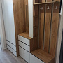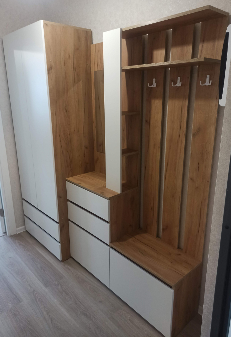 Модуль для прихожей представляет собой вешалку из трех планок ЛДСП с установленными на них 2х рожковыми крючками с полками для головных уборов, тумбу-обувницу с закрытыми отсекоми для хранения с распашной створкой и ящикоми для мелочей на шариковых направляющих. На тумбе установлено зеркало, под вешалкой есть место хранения стеллажного типа. Фасады накладные.