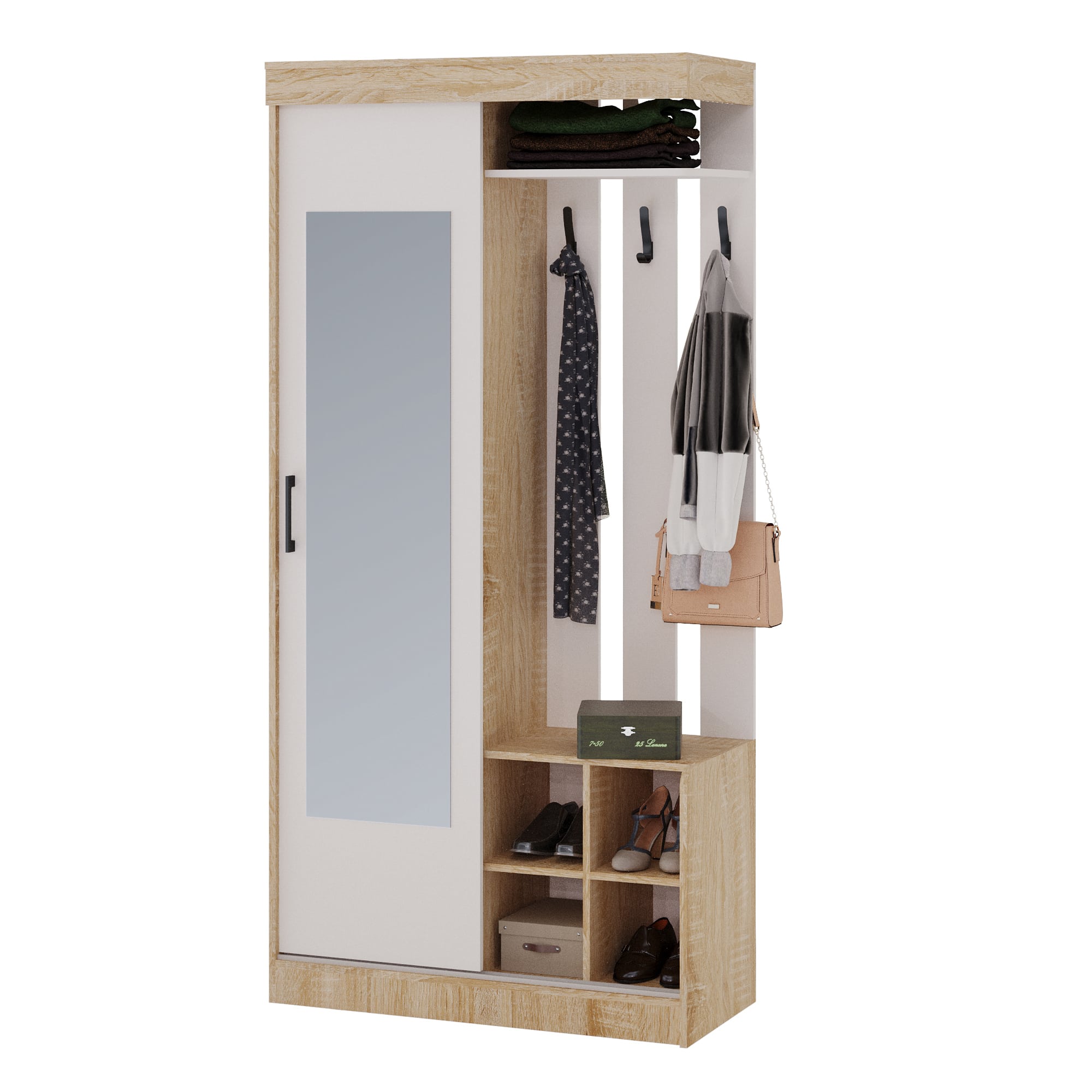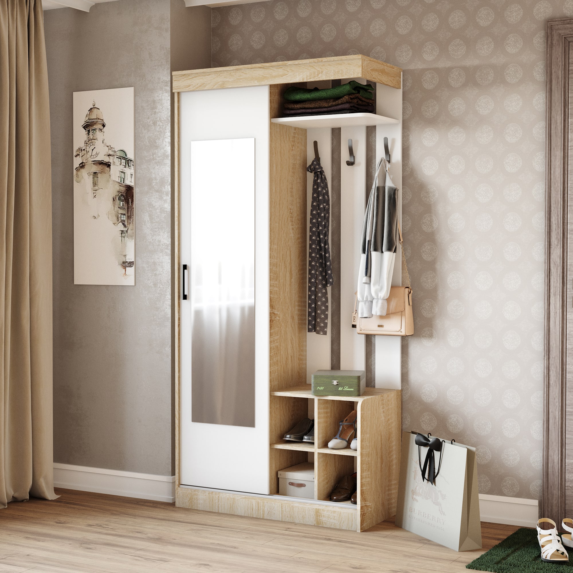 В состав прихожей входит купейный шкаф с вешалкой для верхней одежды и полками для обуви.