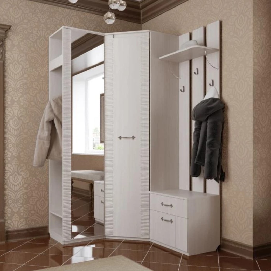 Создатели данной прихожей пошли на маленькую хитрость для экономии пространства: "Элана" имеет очень интересное угловое расположение. В закрытых и открытых шкафах, по всей длине одного из которых расположено зеркало, поместится необходимое количество одежды, обуви, головных уборов, сумок и других необходимых вещей и важных мелочей.